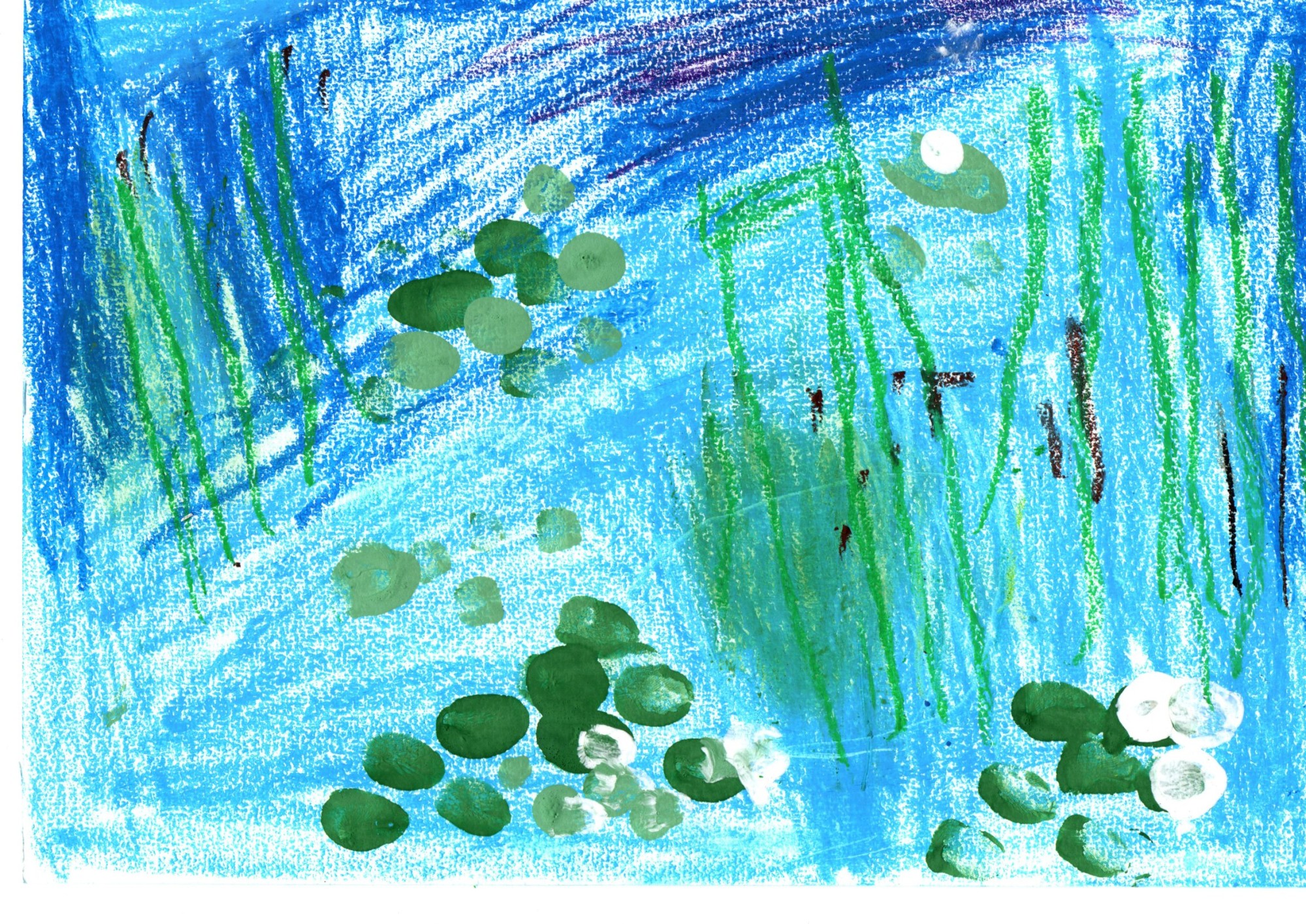 Darbā izmantotas pirkstiņkrāsas un krītiņi.