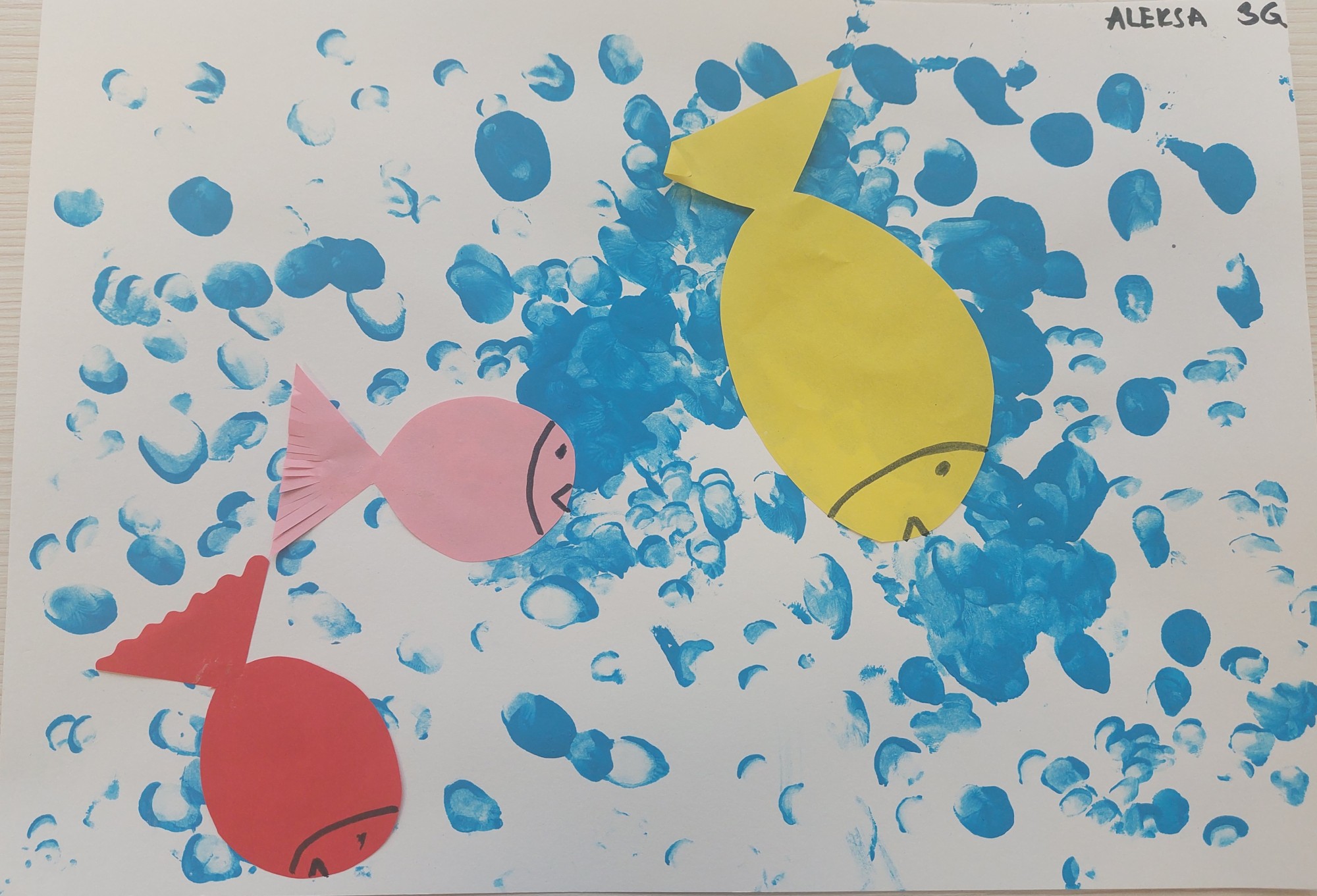 Izvēloties ūdeni attēlot ar guaša un pirksta palīdzību, Aleksa cītīgi atspiež pirksta nospiedumus uz lapas,lai noklātu laukumu. Kad lapa nožuvusi, pielīmē sevis izvēlētās zivis pie papīra pamatnes!