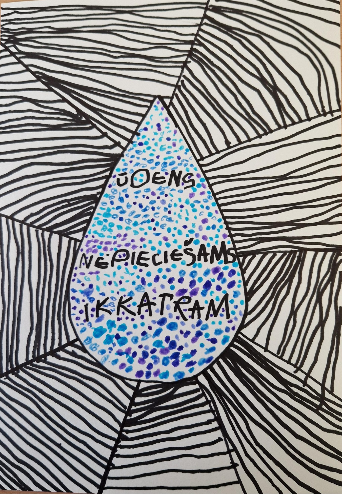 Ūdens- cilvēkiem, mašīnām, lidmašīnām, puķēm, dzīvniekiem, ziloņiem, mājai, kukaiņiem un taureņiem, skudrām, gliemezim, zālītei, visai dabai, lapām un kokiem - Ūdens ir nepieciešams ikkatram! Katra strīpiņa mūsu darbā nogādā ūdeni kādam, kam tas nepieciešamas, kā liels sarežģīts akvedukts.