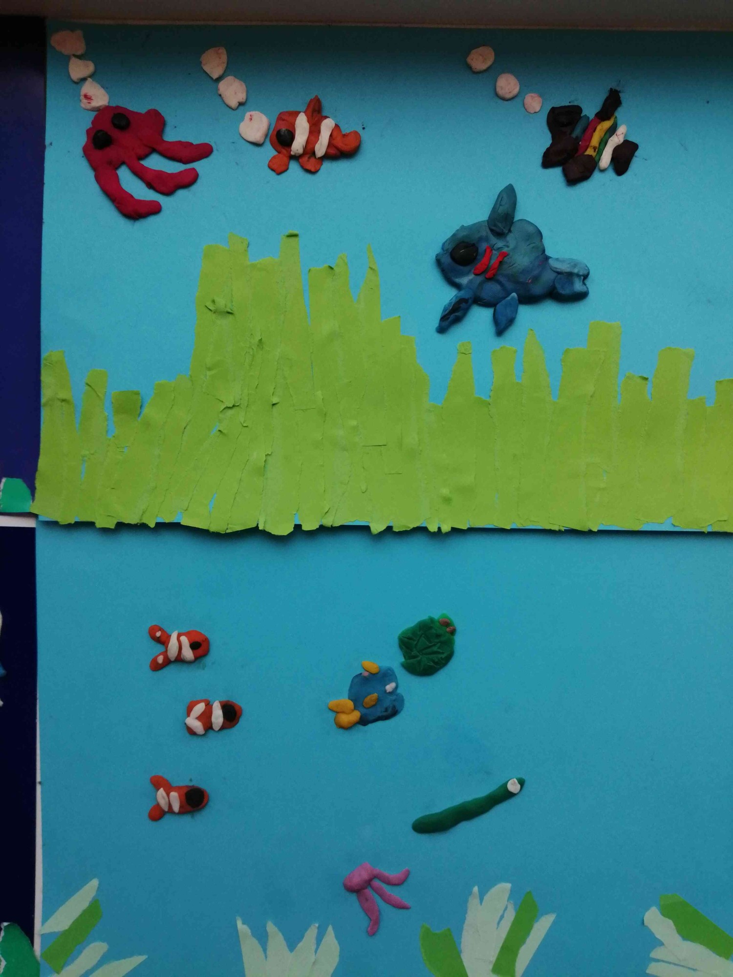 Grupas bērni plēšanas tehnikā līmējot zemūdens augu pasauli un no plastilīna veido okeāna ūdens pasauli.