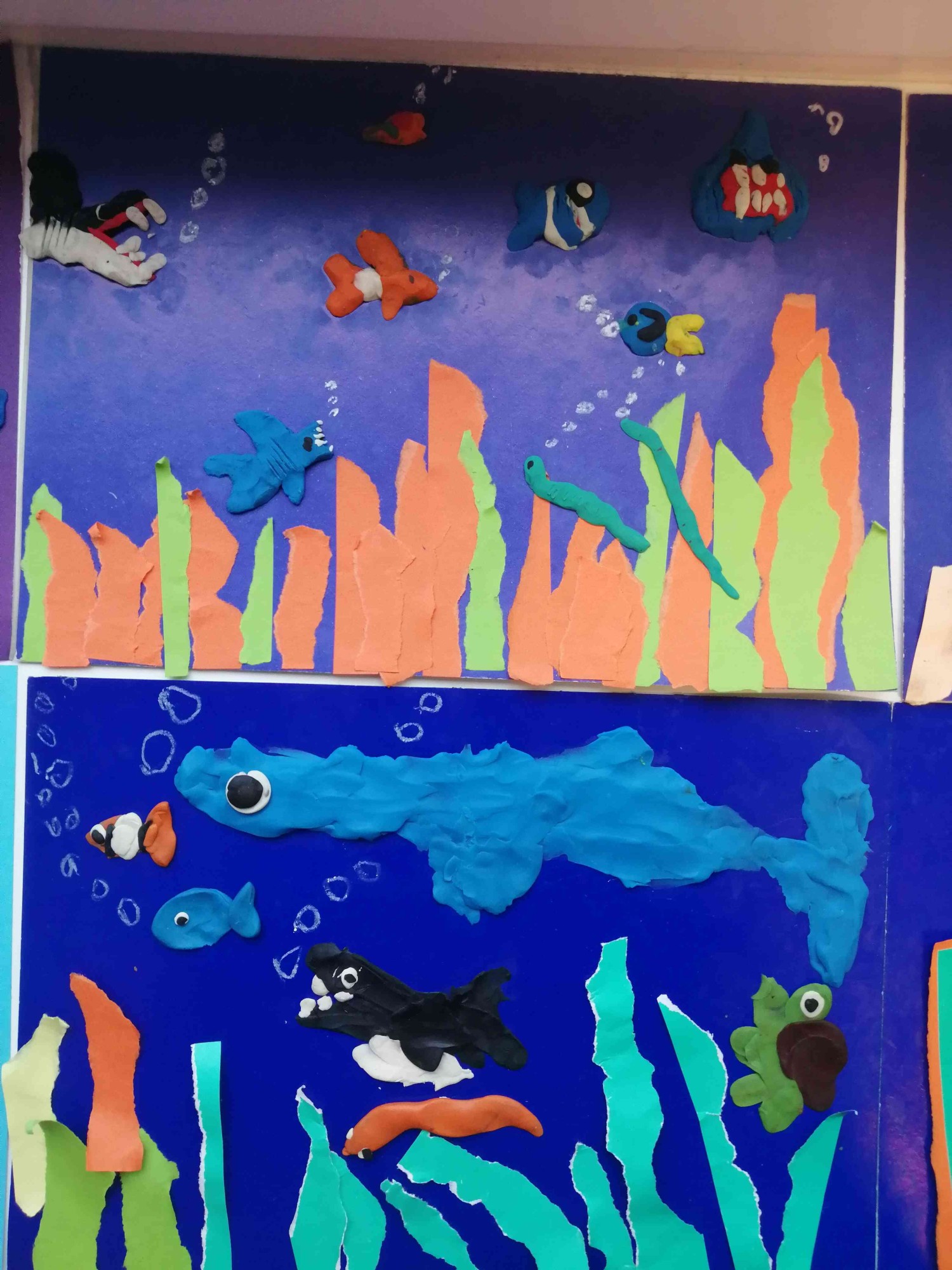 Grupas bērni plēšanas tehnikā līmējot zemūdens augu pasauli un no plastilīna veido okeāna ūdens pasauli.