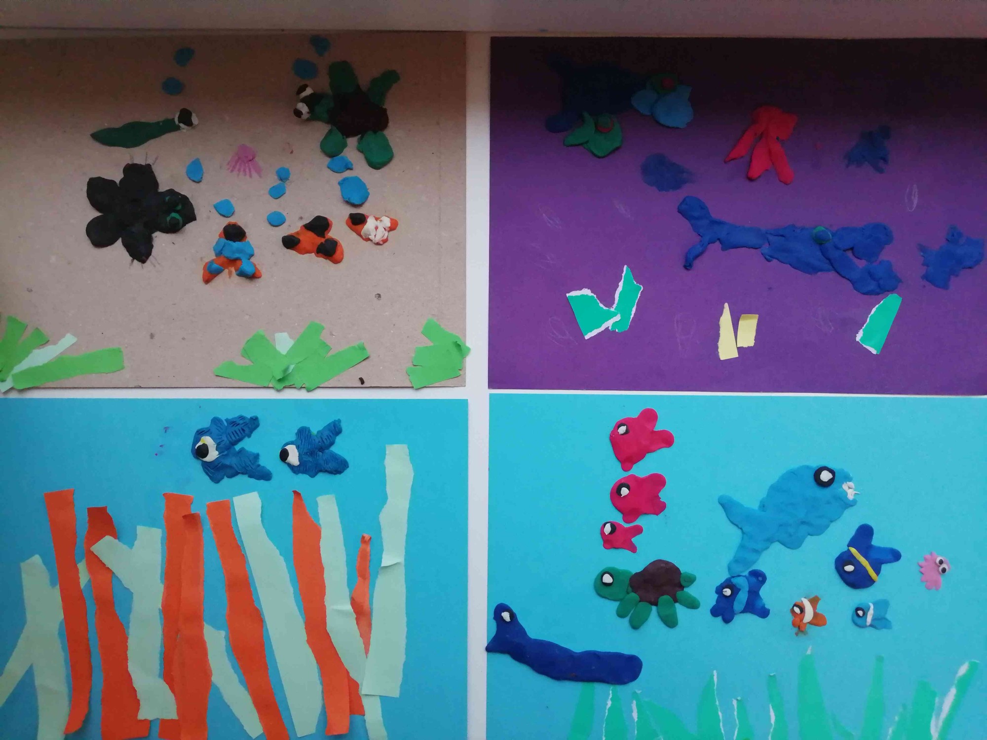 Grupas bērni plēšanas tehnikā līmējot zemūdens augu pasauli un no plastilīna veido okeāna ūdens pasauli.