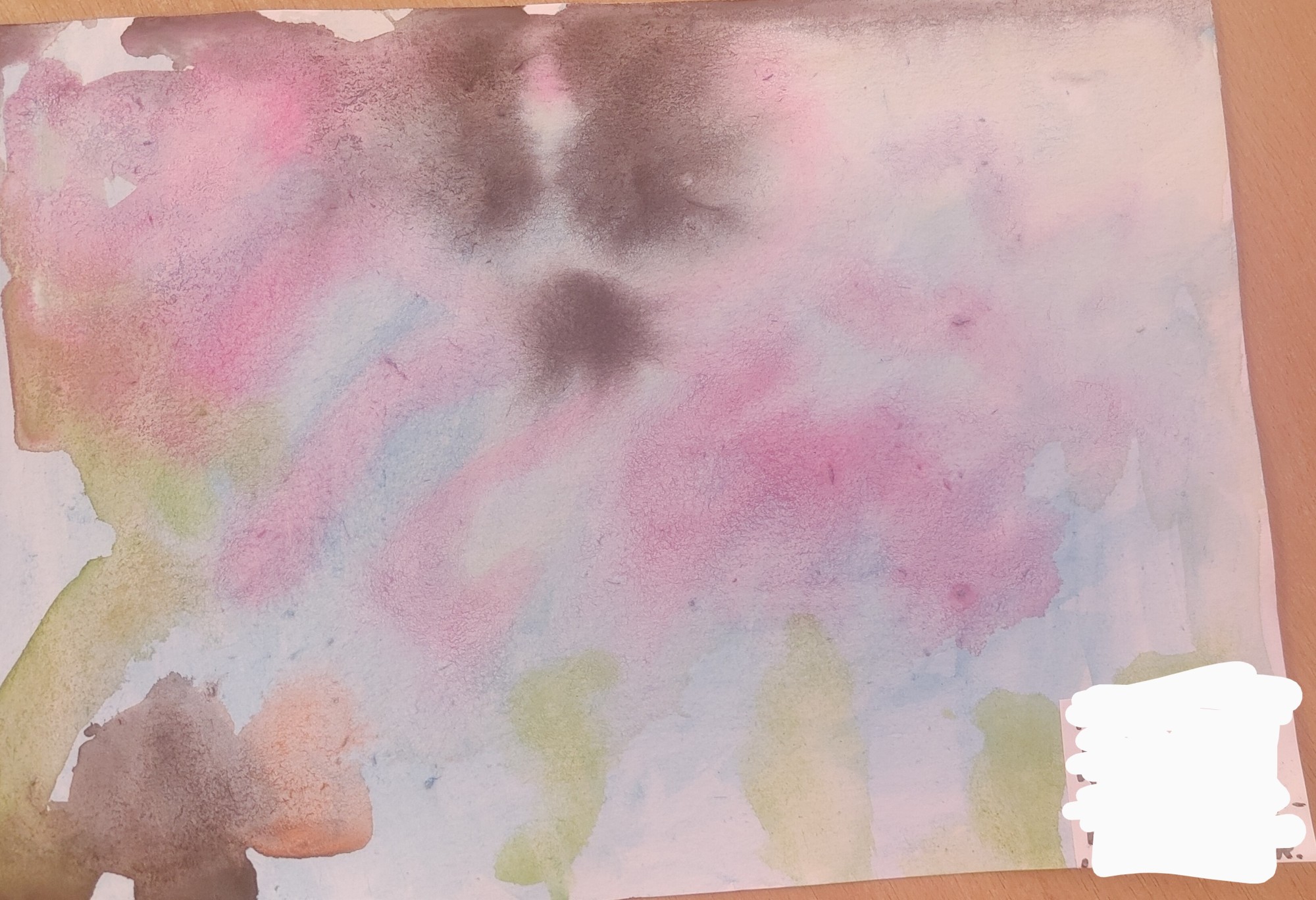 Ar akvareļu krāsām bērns savā darbā attēlo ūdens krāsu dažādību. Lapas apakšējā stūrī iezīmēts ar balto krāsu, jo tajā atspoguļots bērna vārds un uzvārds!