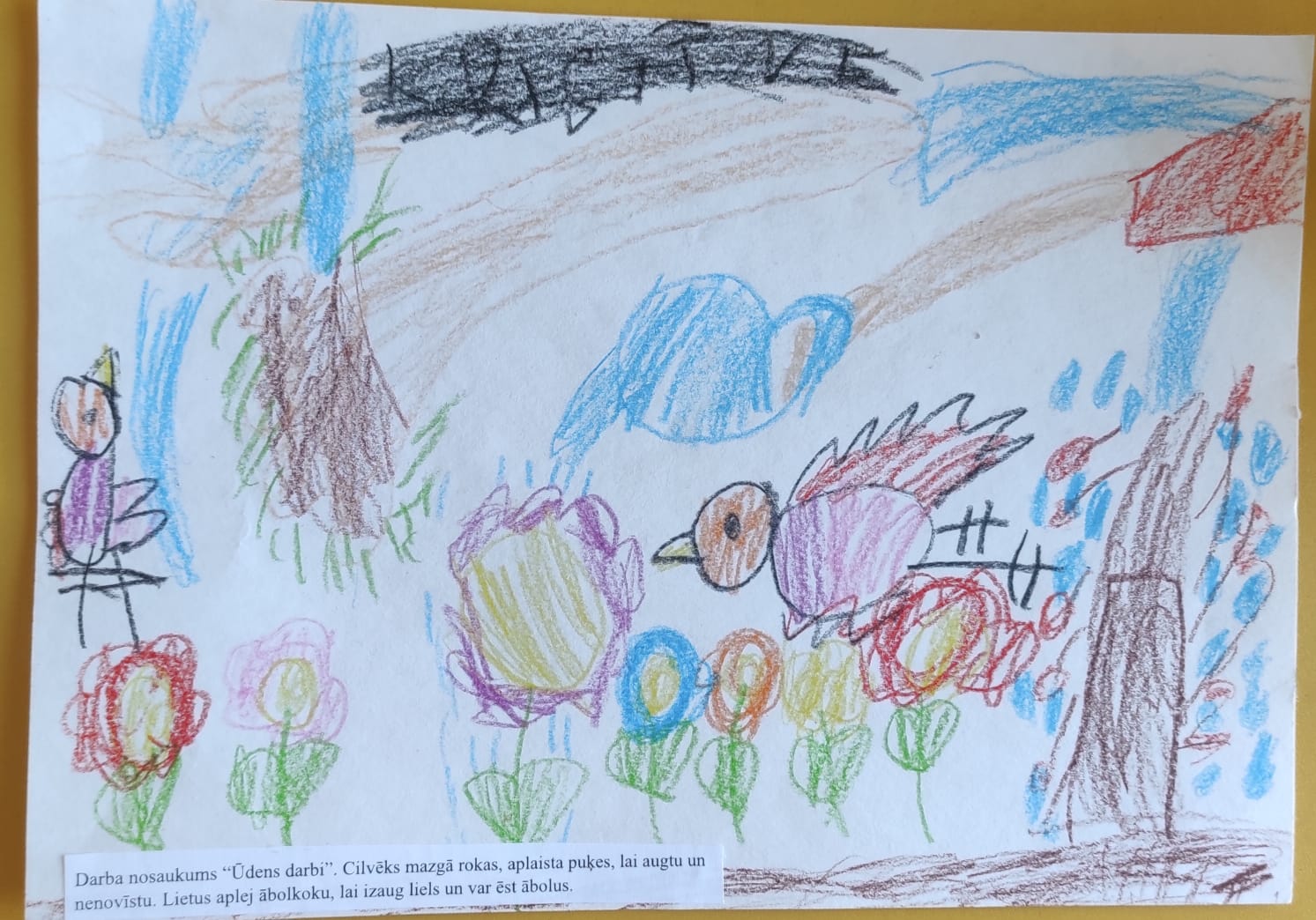 Cilvēks mazgā rokas, aplaista puķes, lai augtu un nenovīstu. Lietus aplej ābolkoku, lai izaug liels un var ēst ābolus.