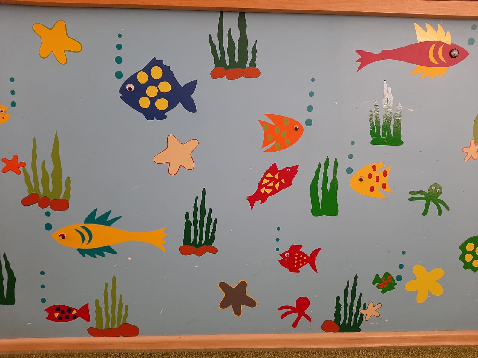Rūķi ir lieli pētnieki! Ļoti patīk zemūdens valstība un ir liela interese, kas notiek ūdenī gan upē, gan jūrā, gan arī okeānā. Radošais darbs ir tapis aplikāciju tehnikā , izmantojot dažādu krāsu līmplēves, uz neapdzīvotas sienas guļamistabā, kas ir zilā krāsā. Ja papīra darbiņš, iespējams tiks nolikts plauktā, tad šis katru dienu ir apskatāms un uzzinot ko jaunu un interesantu par zemūdens valstību, papildināms.