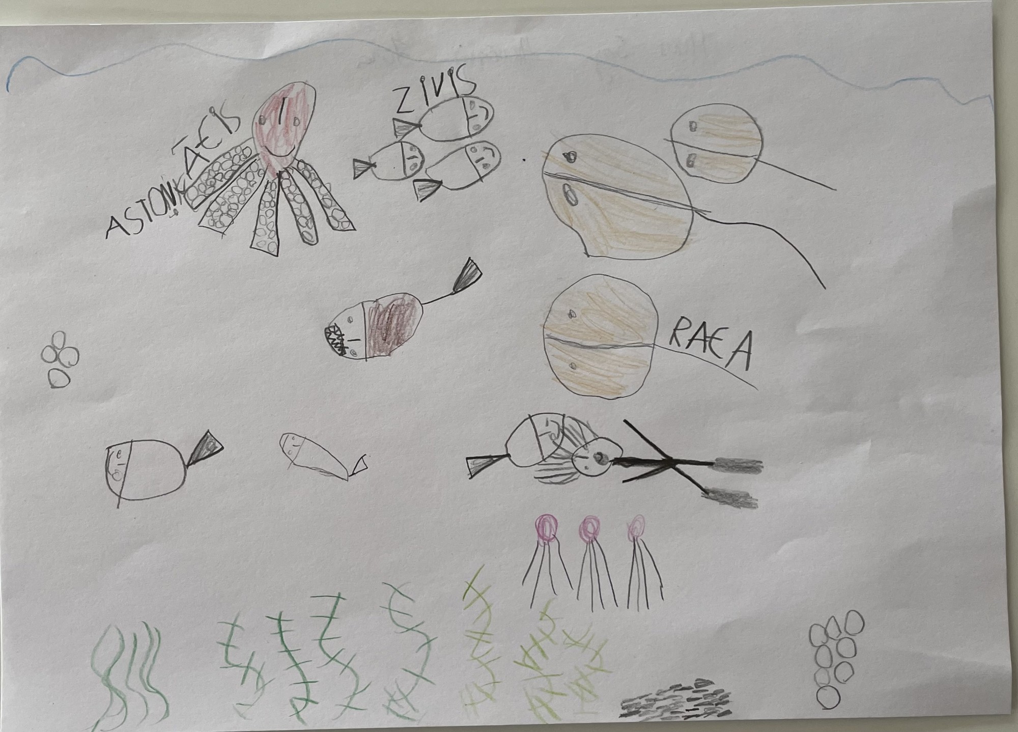 Attēlā attēlots, kā jūrā dzīvo tās iemītnieki. Ūdens ir to mājas, bez ūdens viņu dzīve nebūtu iespējama.