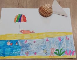 Lietussargs, sega, zivis, kas peld pa jūras ūdeni.