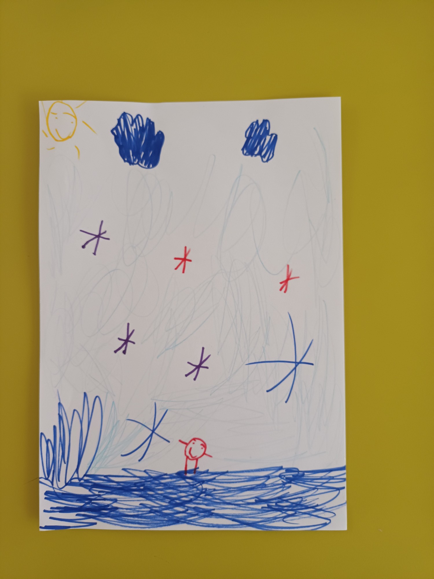 Zēns zvana draugam. Stāsta,cik ārā ir sasalis ledus. Krīt sniegs. Spīd silta saulīte.
