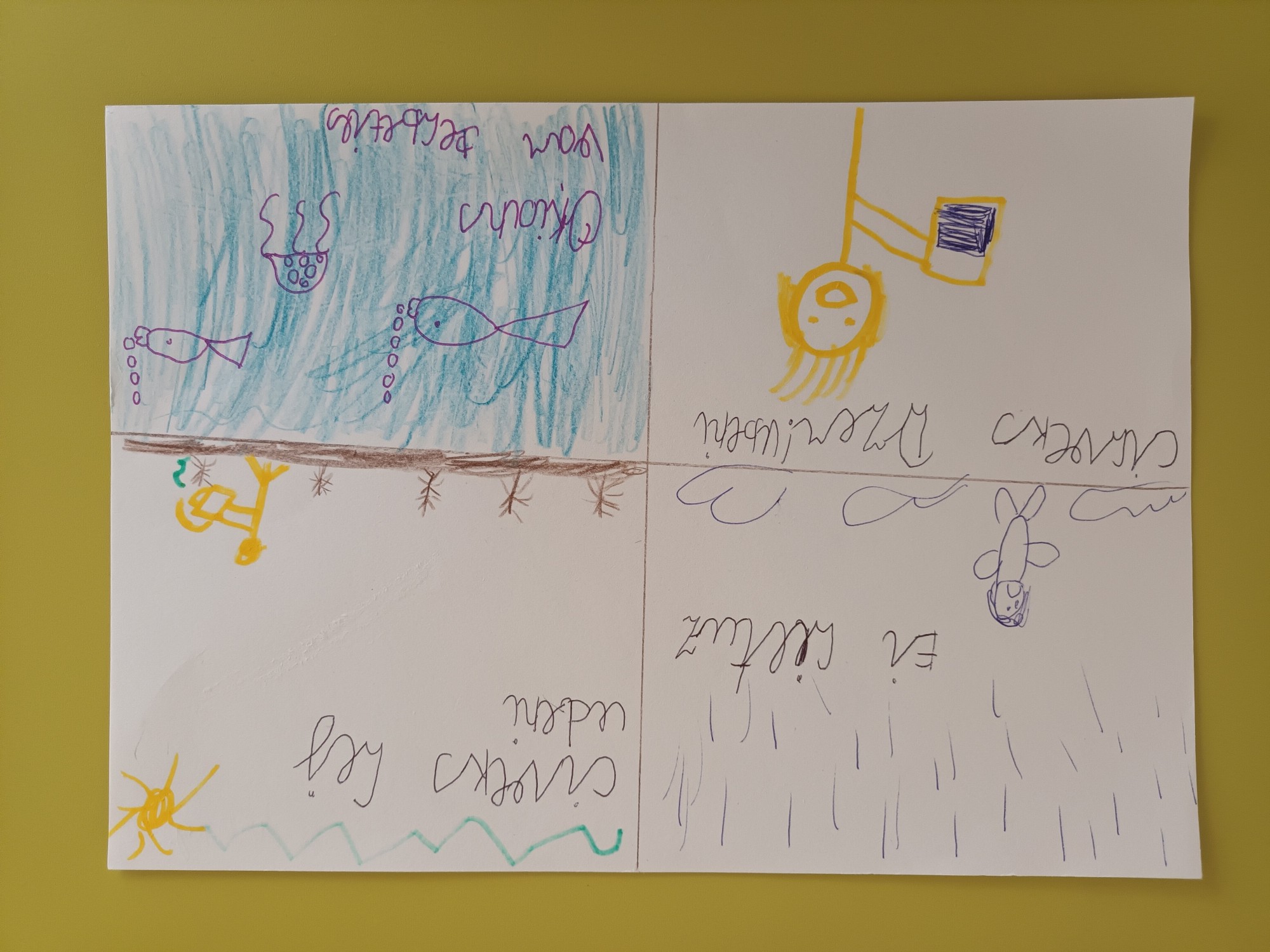 Ārā līst lietus. Cilvēki lej ūdeni augļiem. Cilvēks dzer ūdeni. Okeānā var zivtiņas un astoņkājis peldēt.