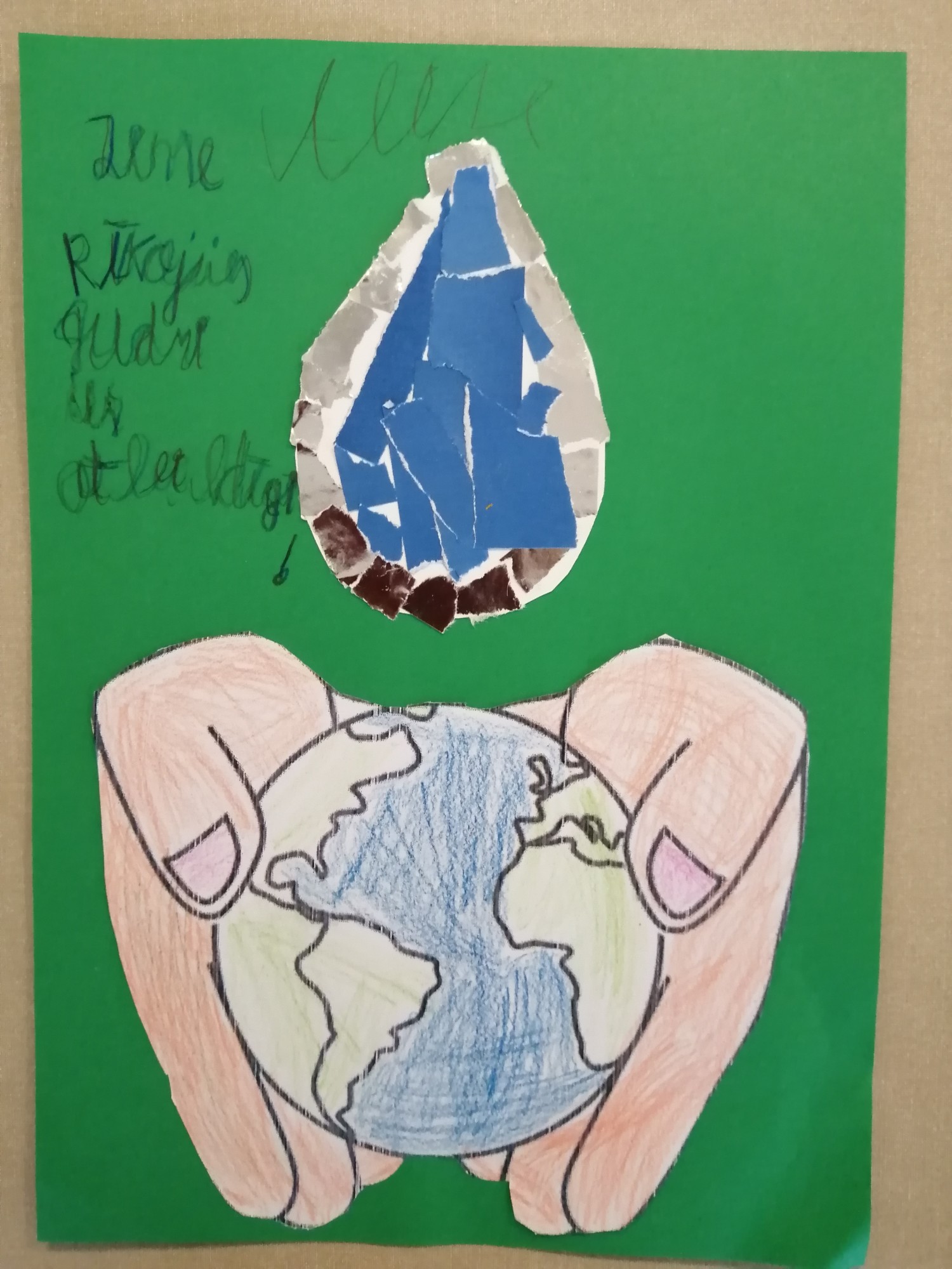 Ūdens mūsu pasaulē. Krāsu zīmuļi, aplikāciju papīrs.