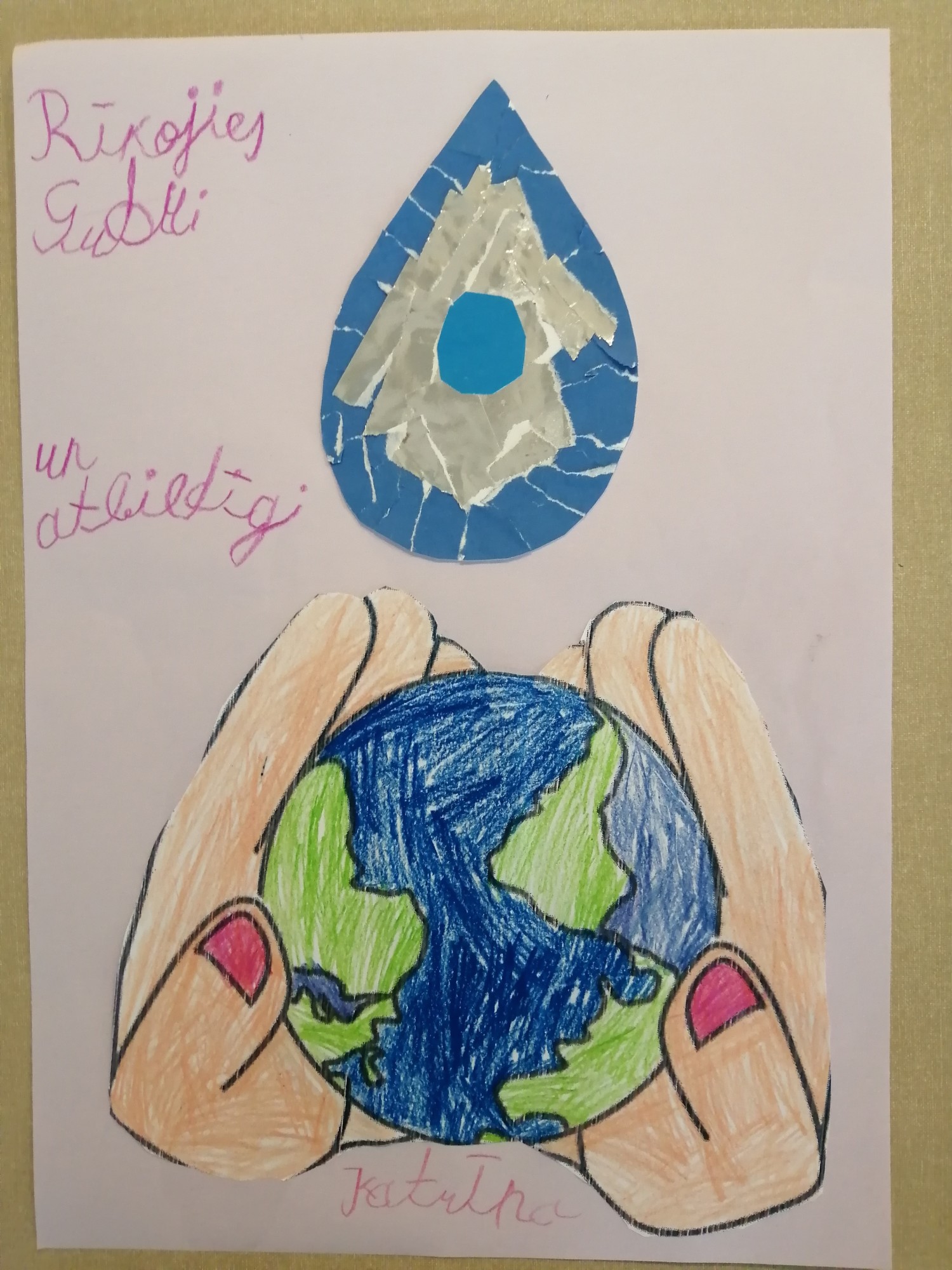 Ūdens mūsu pasaulē. Krāsu zīmuļi, aplikāciju papīrs.