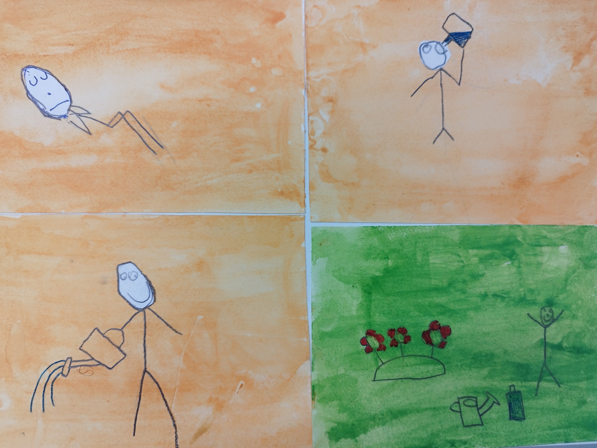 Cilvēks no sākuma bija ļoti bēdīgs, bet tad padzērās ūdeni un kļuva priecīgs, sāka laistīt zāli un visapkārt, lai viss izaugtu un arī būtu priecīgs. Viss izauga, sazaļoja un saziedēja un cilvēks vairs nekad nebija bēdīgs.