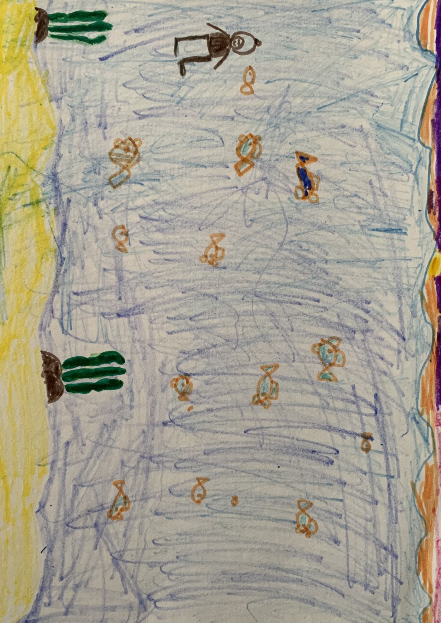 Akvalangists peld kopā ar zivtiņām tīrā jūrā saulrieta laikā.