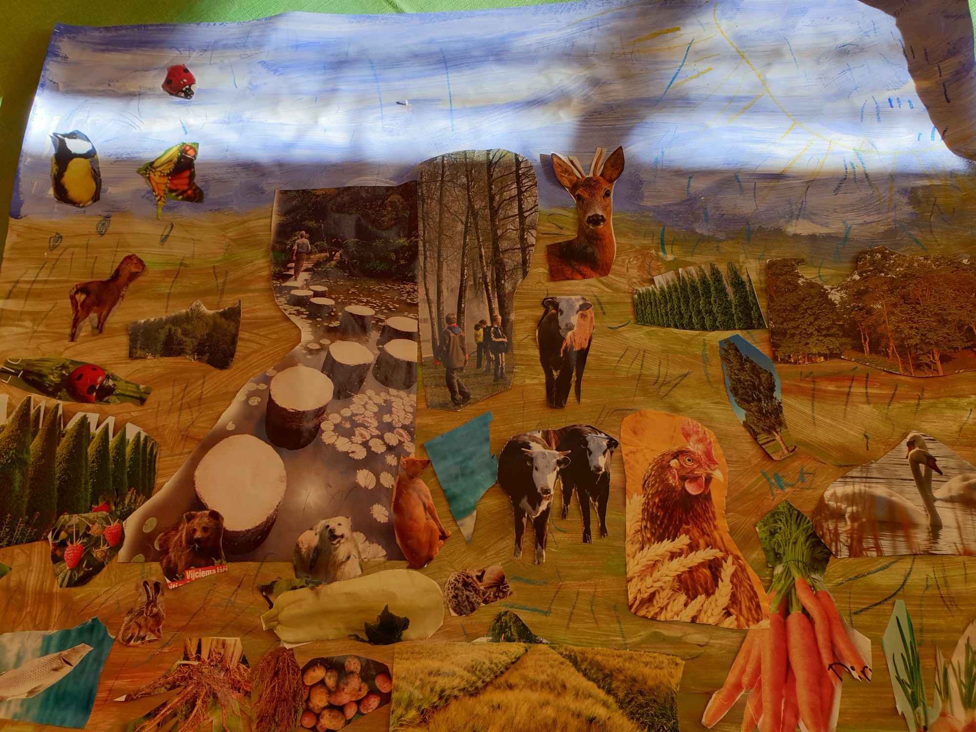 Fons noklāts ar ūdens krāsām, no žurnāliem izgriezti attēli, visiem un visam, kam vajadzīgs ūdens, lai dzīvotu.