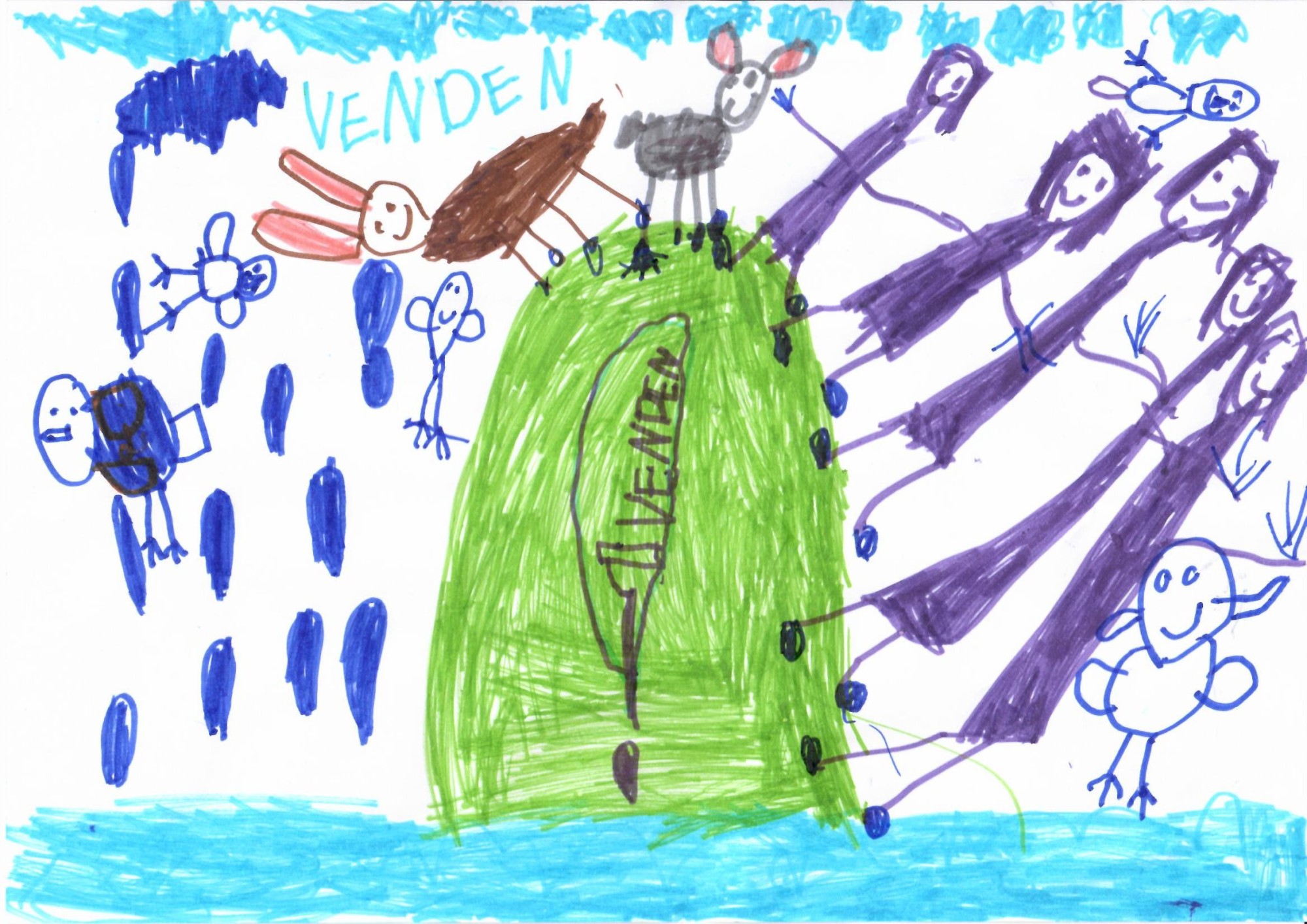 Cilvēki pie upes no kalna skatās, kā upē viļņi šalc un kā debesīs putni lido, kā lietus līst upē. Ūdens paliek vairāk, jo lietus līst upē. Ir vairāk ūdens, ko dzert putniņiem un zaķīšiem. Cilvēki iet pēc VENDEN ūdens, lai padzertos. Atgriežot krānu , pa trubu var dabūt cilvēki VENDEN ūdeni.