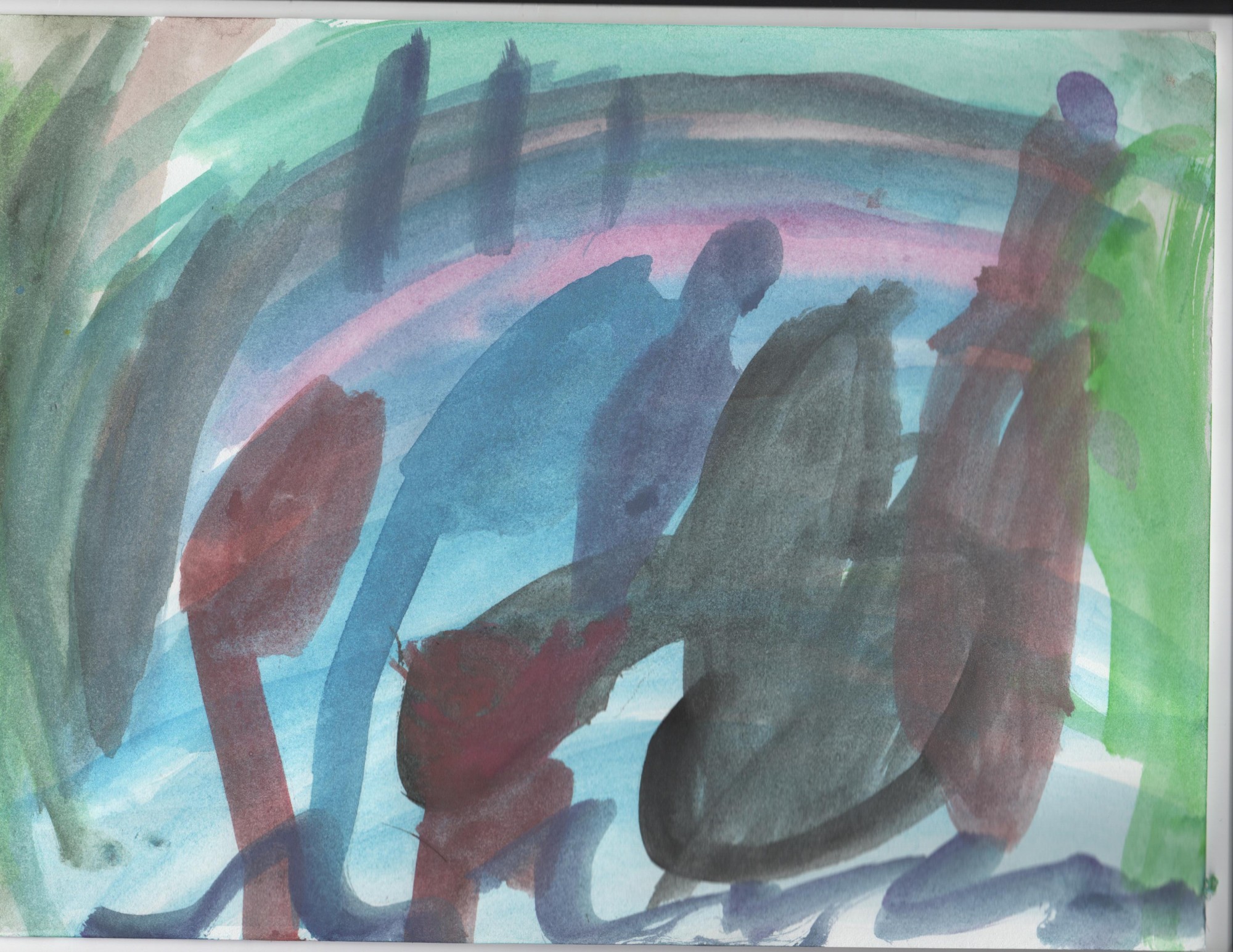 Zīmējumā ir attēlots, kā varavīksne spīd pāri okeānam un okeānā peld zivis un aug puķes.