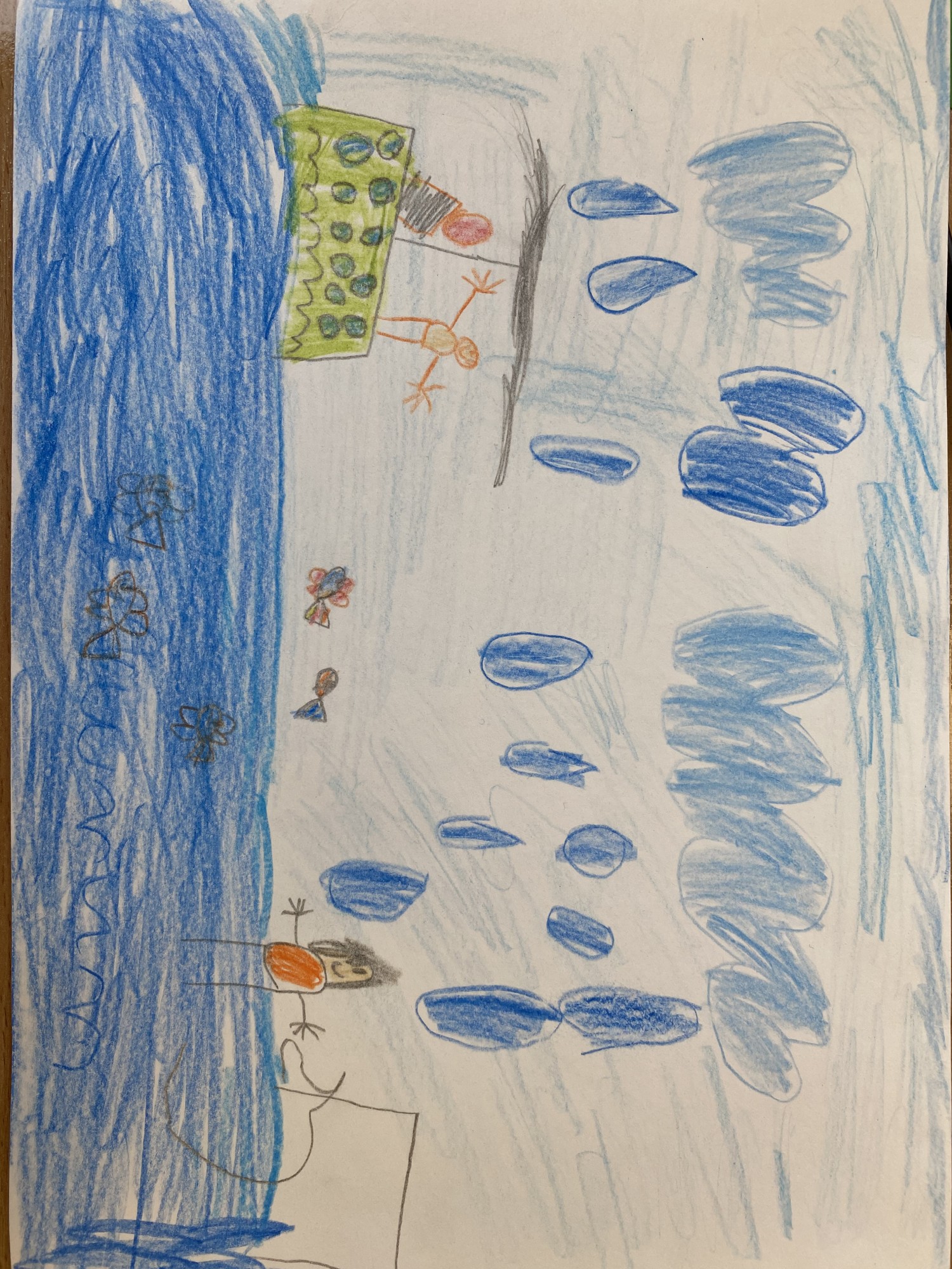 Lietus līst. Mamma peldās jūrā. Tētis gatavojās ielēkt ūdenī no kuģīša ar nojumi.