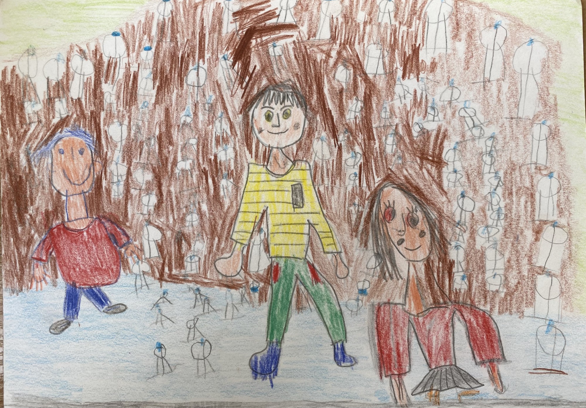 Mamma, brālis un es pērkam ūdeni veikalā.