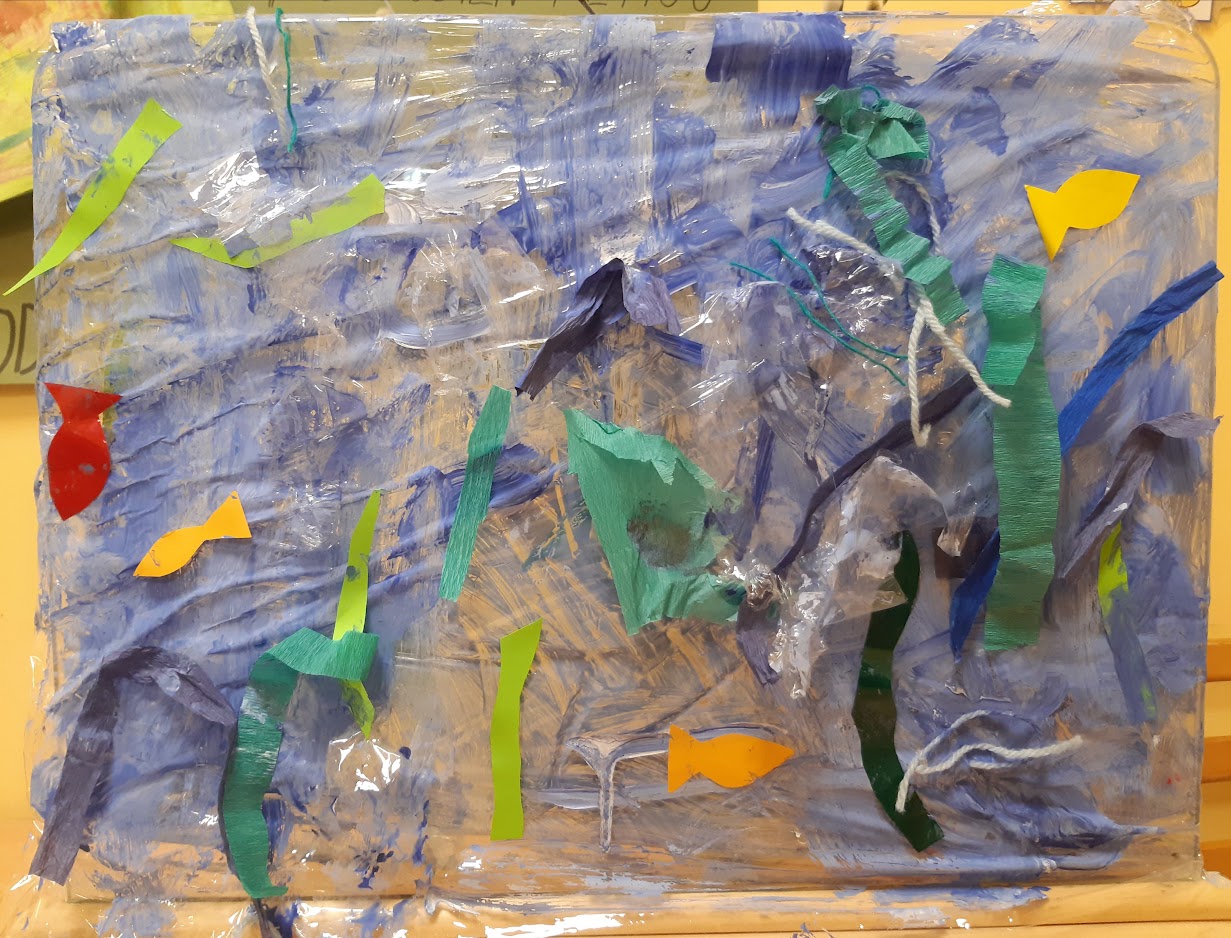 Zīmējums veidots vertikālā veidā, uz stikla pamatnes, kas pārklāta ar plēvi bērni jauca ūdens toņu krāsas un rotāja to ar dažādiem materiāliem (papīru, dziju, u.c.). Mazās zivtiņas, kurām tika veidots šis zīmējums, iepazīts un izpēta dažādos rotājumus un bērnu brīnišķīgās gleznotāju spējas.
