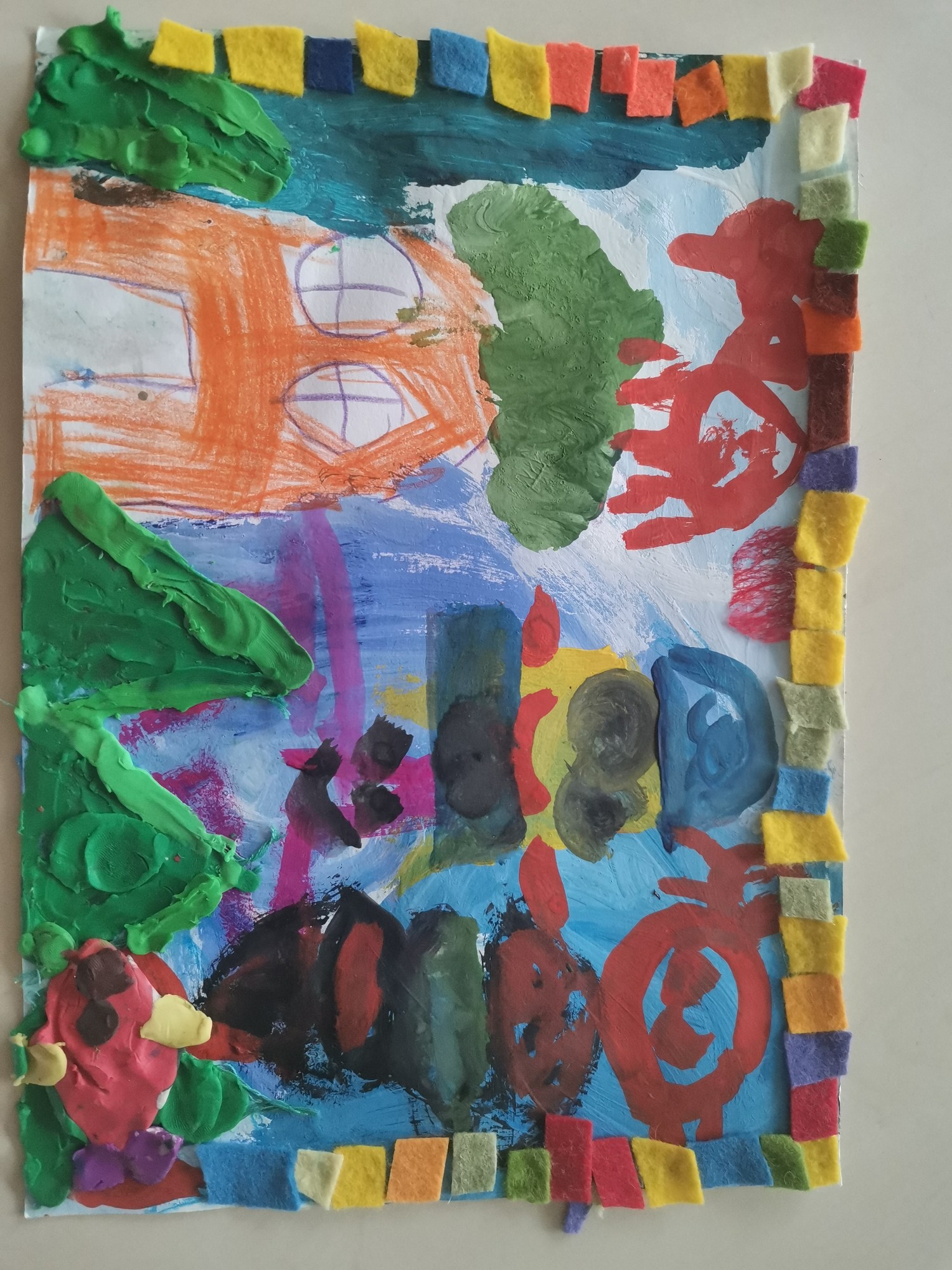 Tehnika gan ar plastilīnu, gan guašu krāsām, krītiņiem, filca audumu.