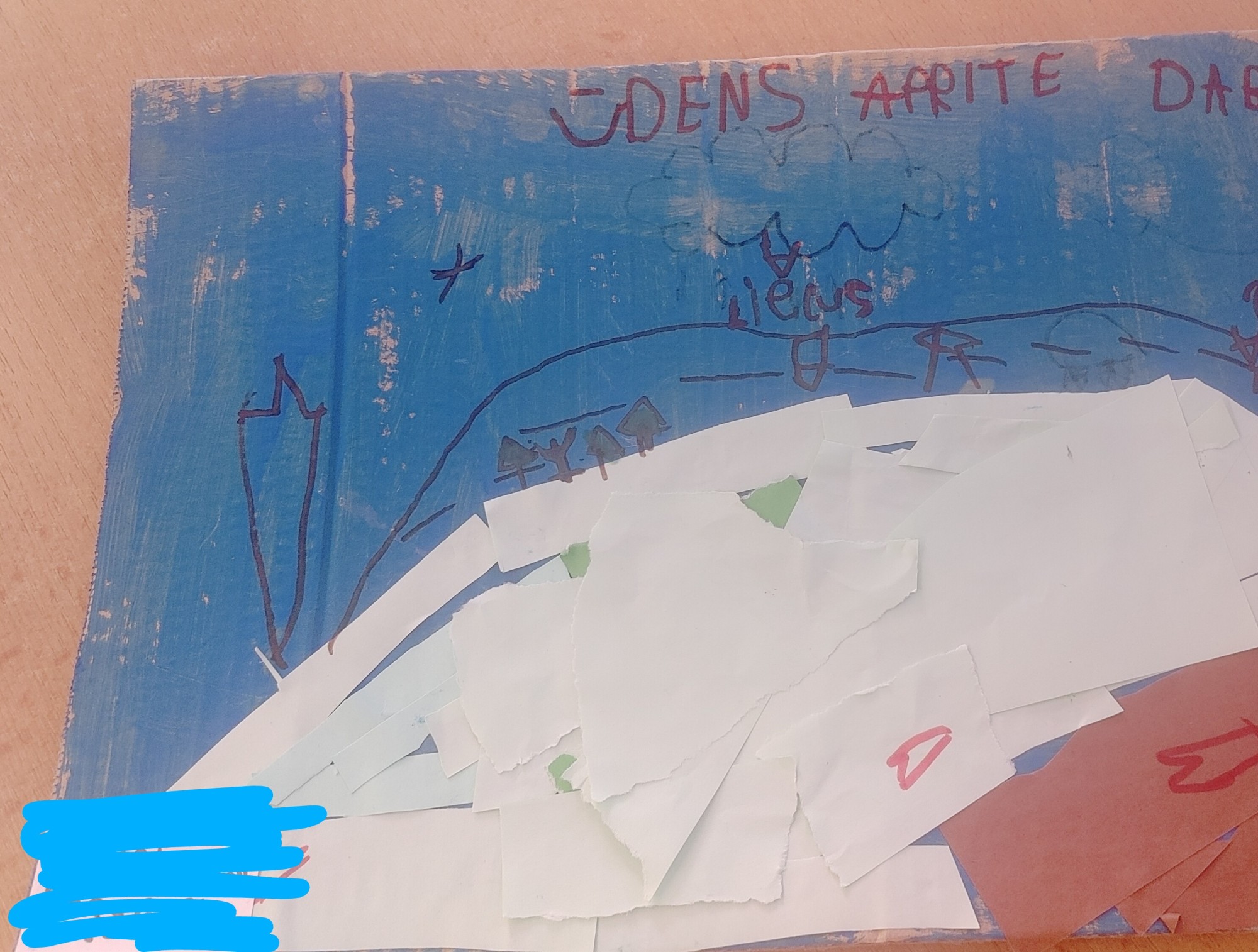 Pamats - kartons. Fons krāsots ar zilas krāsas guašu. Izmantota plēšanas, aplicēšanas tehnika. Zīmēts ar flomasteriem un rakstīti vārdi ar flomasteriem. Lapas apakšējā stūrī iezīmēts ar zilo krāsu, jo tajā atspoguļots bērna vārds un uzvārds!