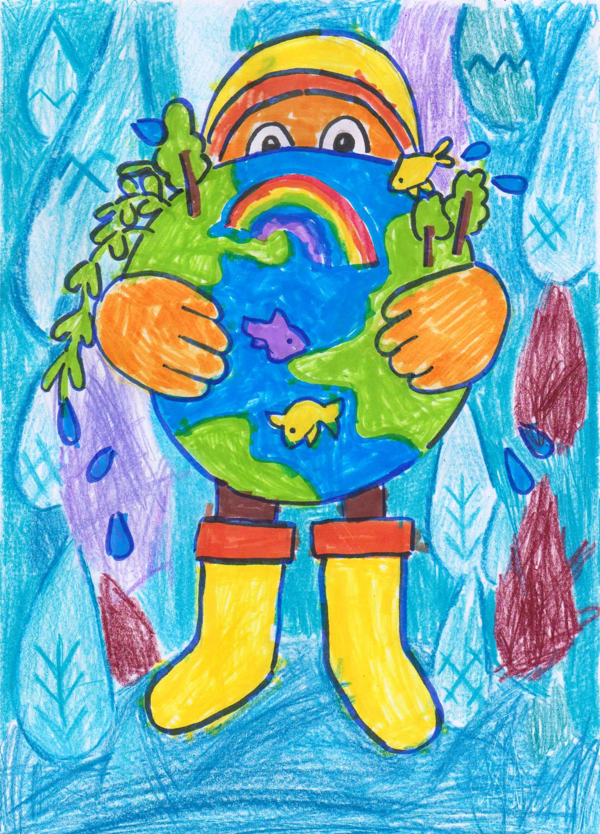 Es mīlu mūsu Zemi ar skaistiem ūdeņiem, zaļumiem, dzīvniekiem, varavīksni un saulīti. Dārziņā mums skolotāja pastāstīja, ka ūdens ne tikai aizņem lielāko daļu no mūsu planētas, bet ir arī cilvēkos! Tāpēc manā zīmējumā ir daaaudz ūdens!