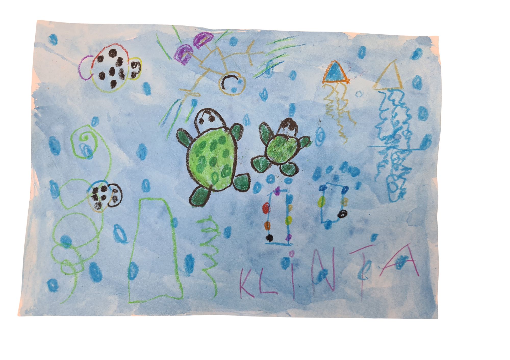 Darbā attēlota zemūdens valstība, kurā ierodas mazais, priecīgais un bezrūpīgais cilvēks. Tā ir cita pasaule. Viss ir krāsains, kustīgām, neierastām formām. Iztēlē krāsas jaucas un mainās. Tas, kas mums ir vienā brīdī “kvadrātains” iztēlē, top citā formā. Patiesi sapņojošais cilvēks brīvi kustas ūdenī, jūtas laimīgs. Ūdens ir tik viegls, un tajā var elpot. Visa zemūdens valstība ir viņa jaunie draugi, kas rada dažādas skaņas, vibrācijas un sapņa sajūtu. Ūdens ir caurspīdīgs, tas smaržo. Man patīk ūdens, man patīk citādā pasaule. (Izmantotā tehnika, ūdenskrāsas fona radīšanai. Dažādo tēlu zīmēšana ar vaska krītiņiem, tēli, durstīgā zivs, koraļļi, kas pūš burbuļus un zied, ūdens zāles lokanās, draudzīgie bruņurupuči, kodīgās medūzas, priecīgā meitene, kas peld ar ūdenszābakiem un rada ūdens strīpas.)