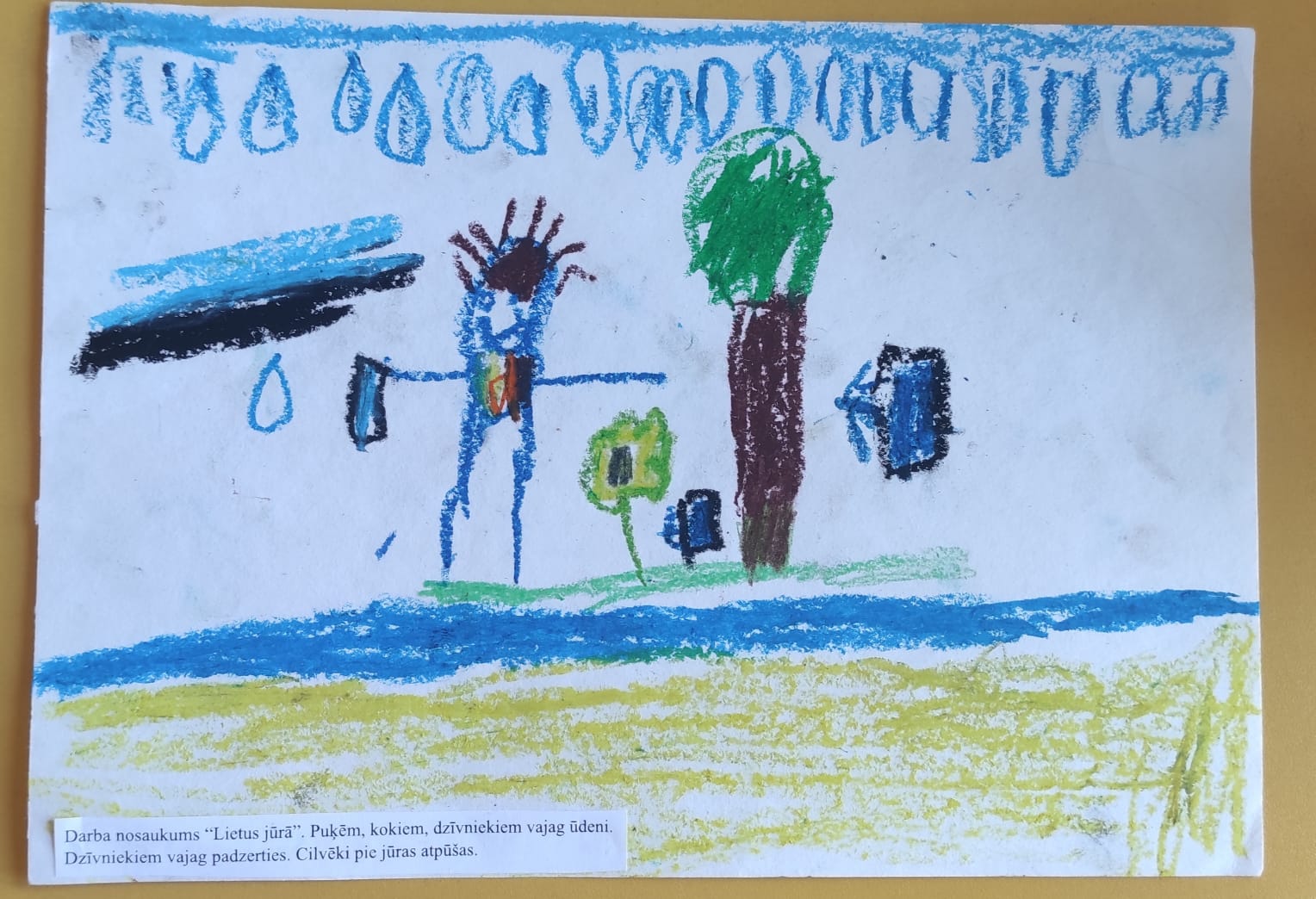 Puķēm, kokiem, dzīvniekiem vajag ūdeni. Dzīvniekiem vajag padzerties. Cilvēki pie jūras atpūšas.