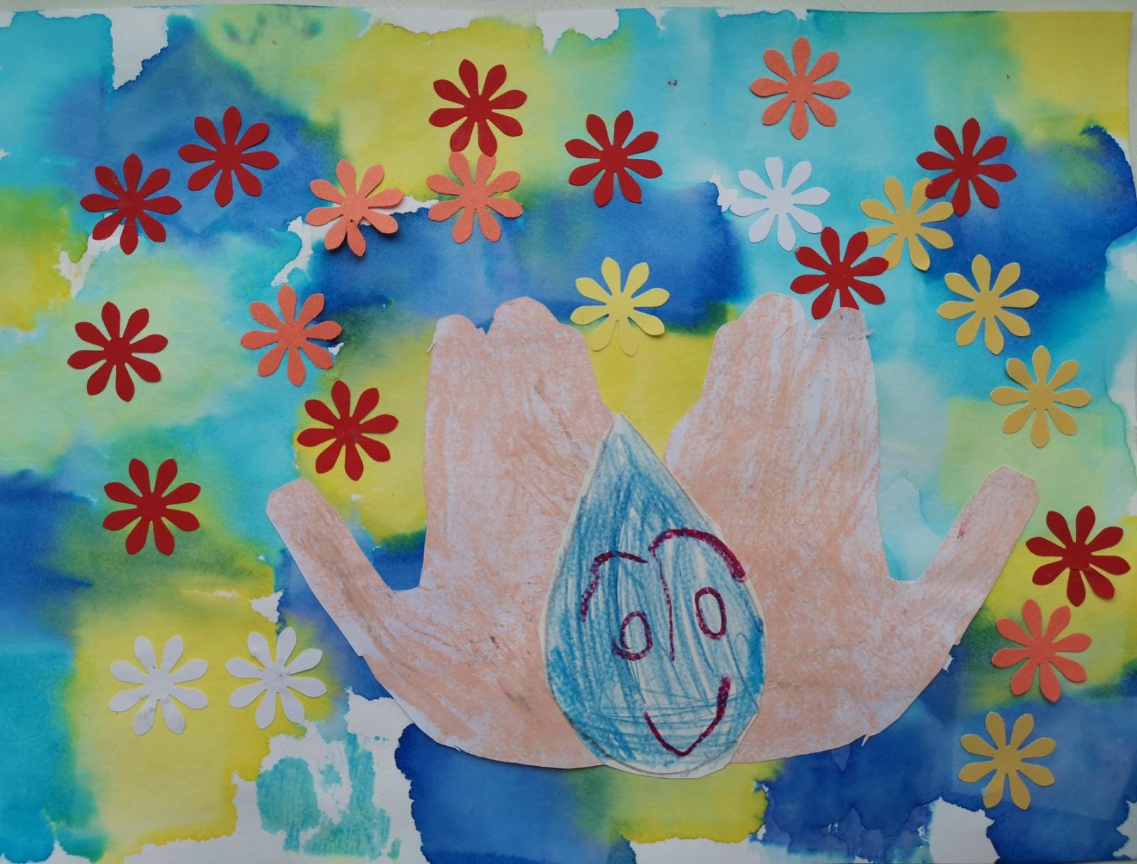 Fons tika krāsots ar kreppapīru. Kreppapīra tika noklāts ar ūdeni un krāsa no kreppapīra izlūda uz lapas. Bērns apvilka savu plaukstu uz baltas lapas, izgrieza un nokrāsoja ar krītiņiem. Lāsīti uzzīmēja, izgrieza un izkrāsoja ar zīmuļiem, visapkārt pielīmēja papīra puķītes.