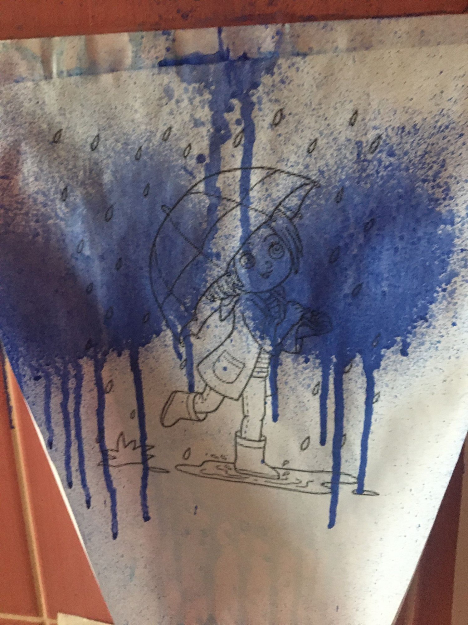 Ūdens smidzinātājā iepildīta krāsa, kura pūšot attēlo lietus mākoni.