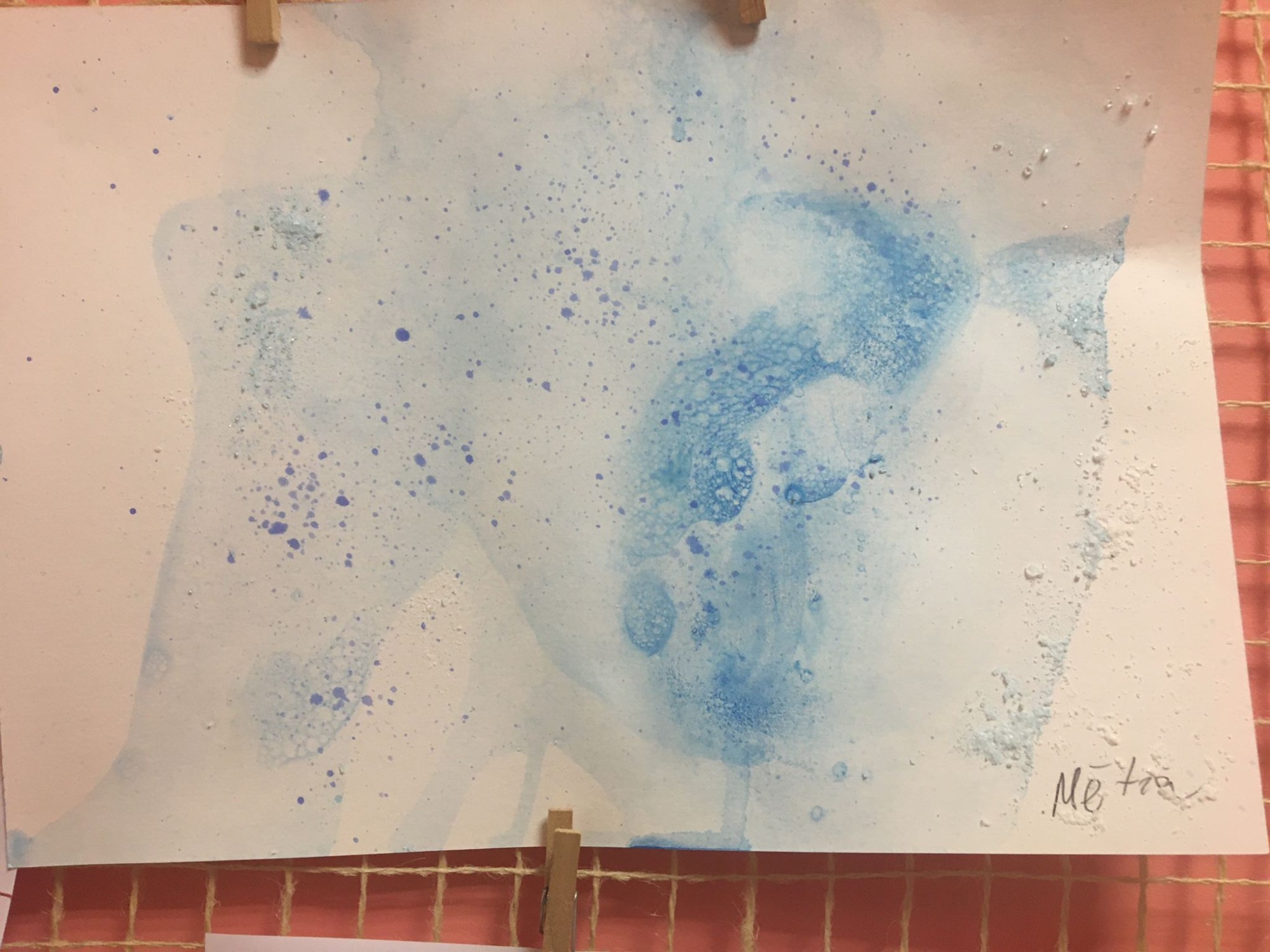 Ar sāls, ziepju, līmes un guaša krāsas tehniku attēlo pavasara tuvošanos un sniega kušanas procesu