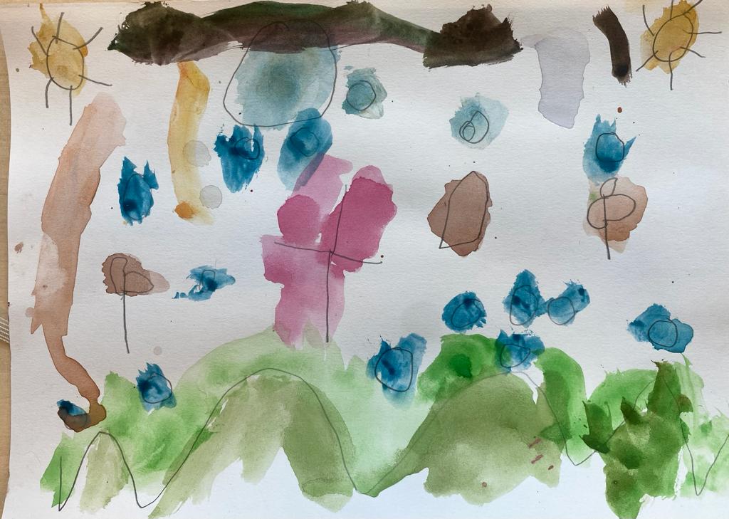 Saule izkausē lāstekas, un veidojas ūdens. No ūdens paliek zaļa zāle, un aug puķes.