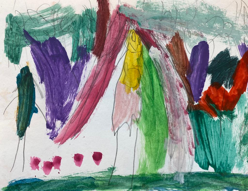 Mēs ar Madariņu priecājamies, jo no krāsinām puķēm radās krāsains lietutiņš.