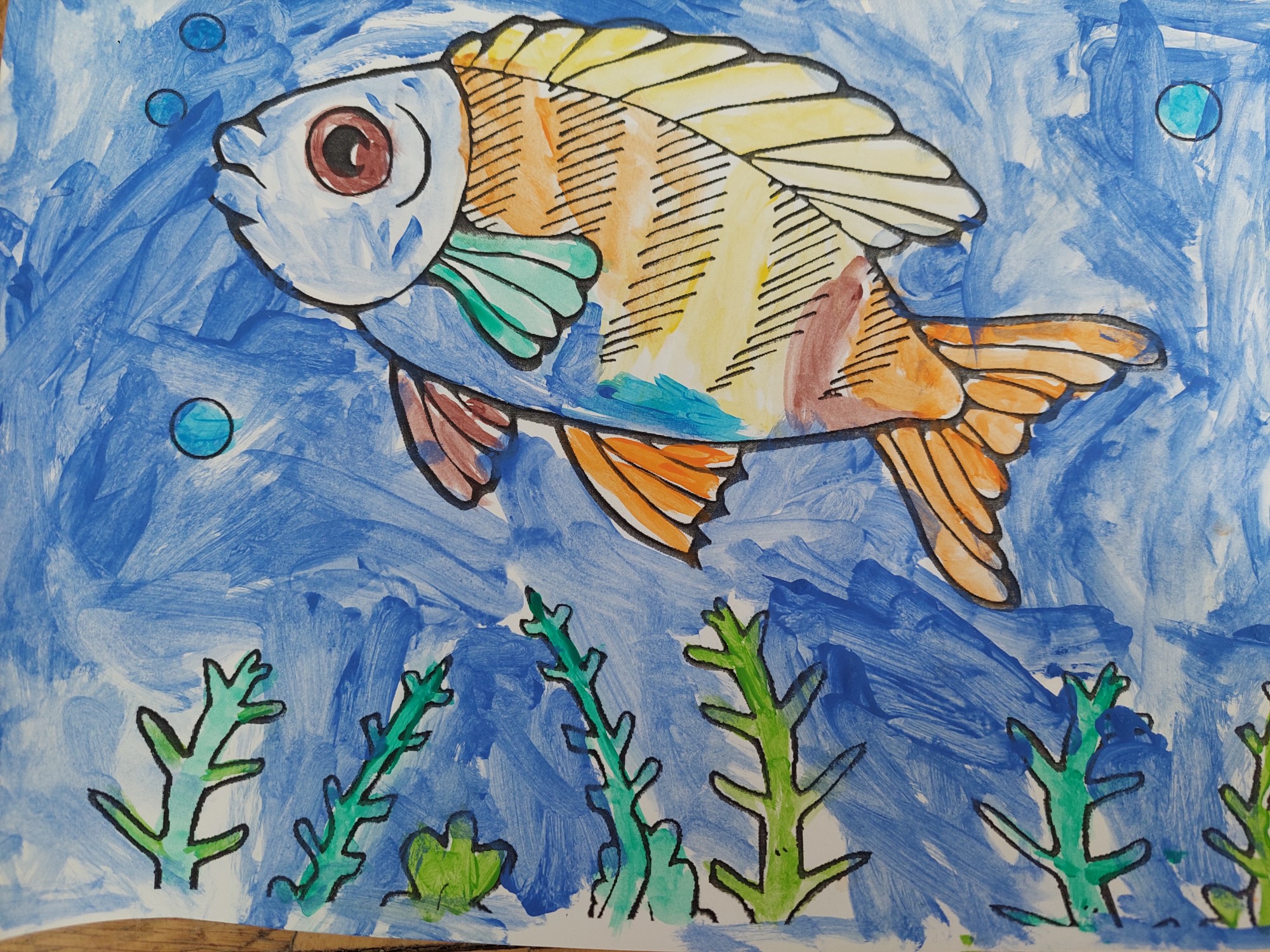 Ūdens pasaule Latvijā. Skolotājas kopā ar bērniem pārrunāja par Latvijā mītošajiem dzīvniekiem, kuriem TĪRS ūdens ir nepieciešams kā dzīves vieta, vai kā barības gūšanas vieta. Bērni dažādās tehnikās attēloja šo TĪRO ūdens pasauli.