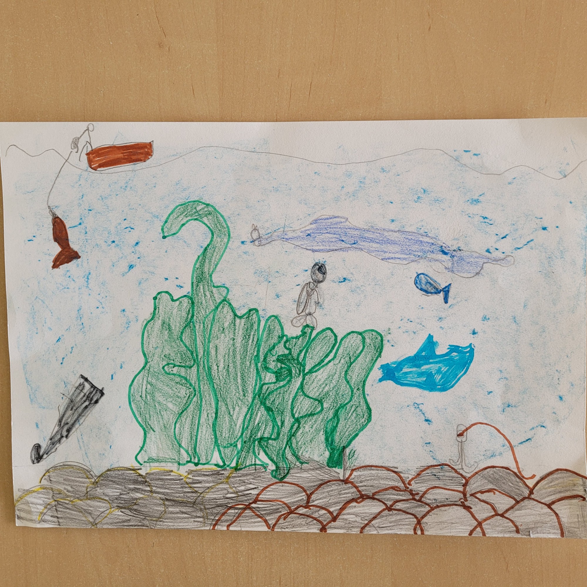 Es uzzīmēju ūdens čūsku, zivis, delfīnu, jūras zāles un akmeņus.