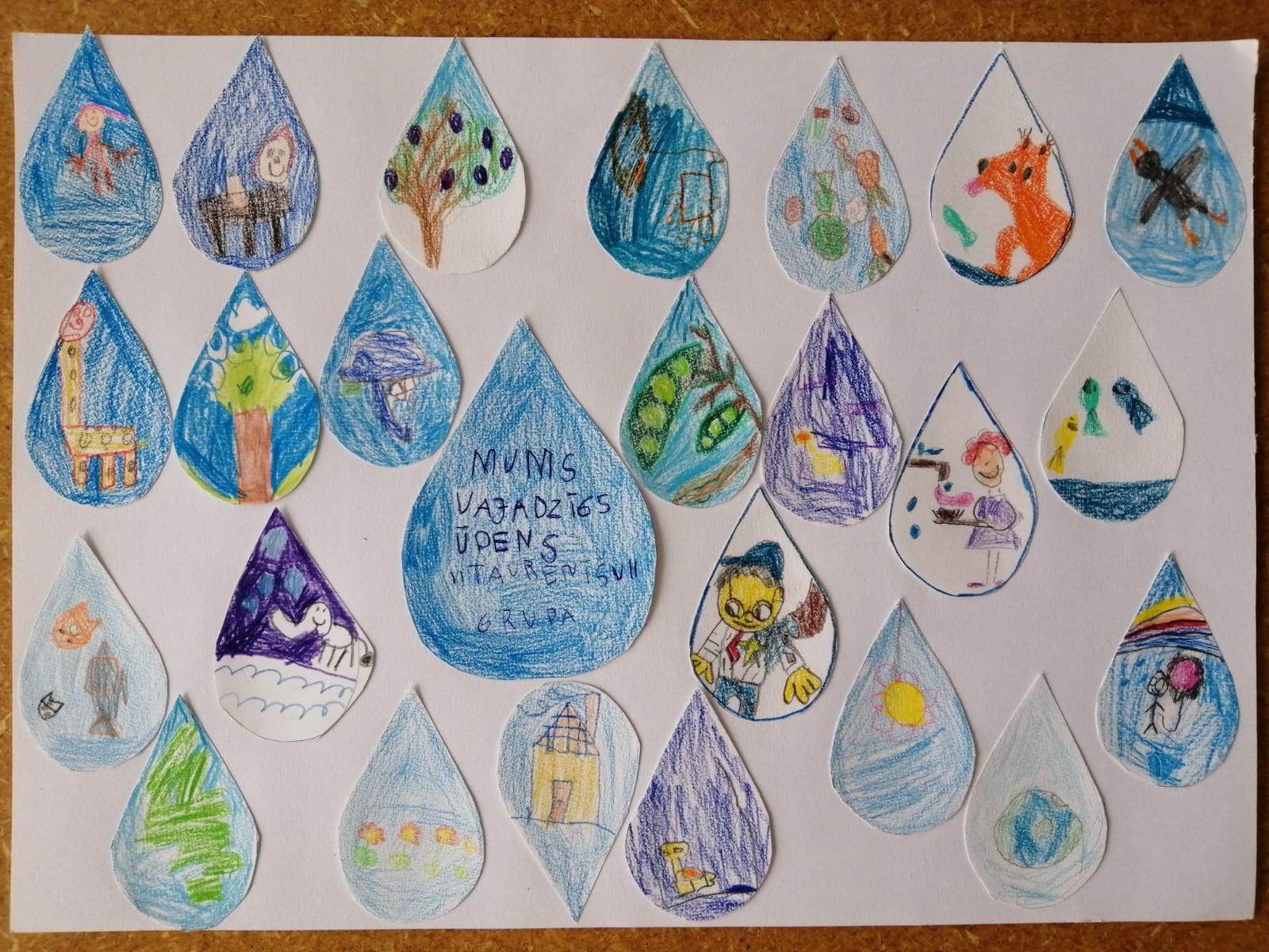 Esam izzinājuši, kam ir nepieciešams ūdens? Tā tapa kolektīvs darbs, kurā apkopojām katra bērna ieceri, ideju, kam pēc viņa domām ūdens ir vajadzīgs. Katra ūdens lāsīte parāda bērna ideju, bet kopā izveidojās ,,Taurenīšu" grupas plakāts ,,Mums vajadzīgs ūdens"