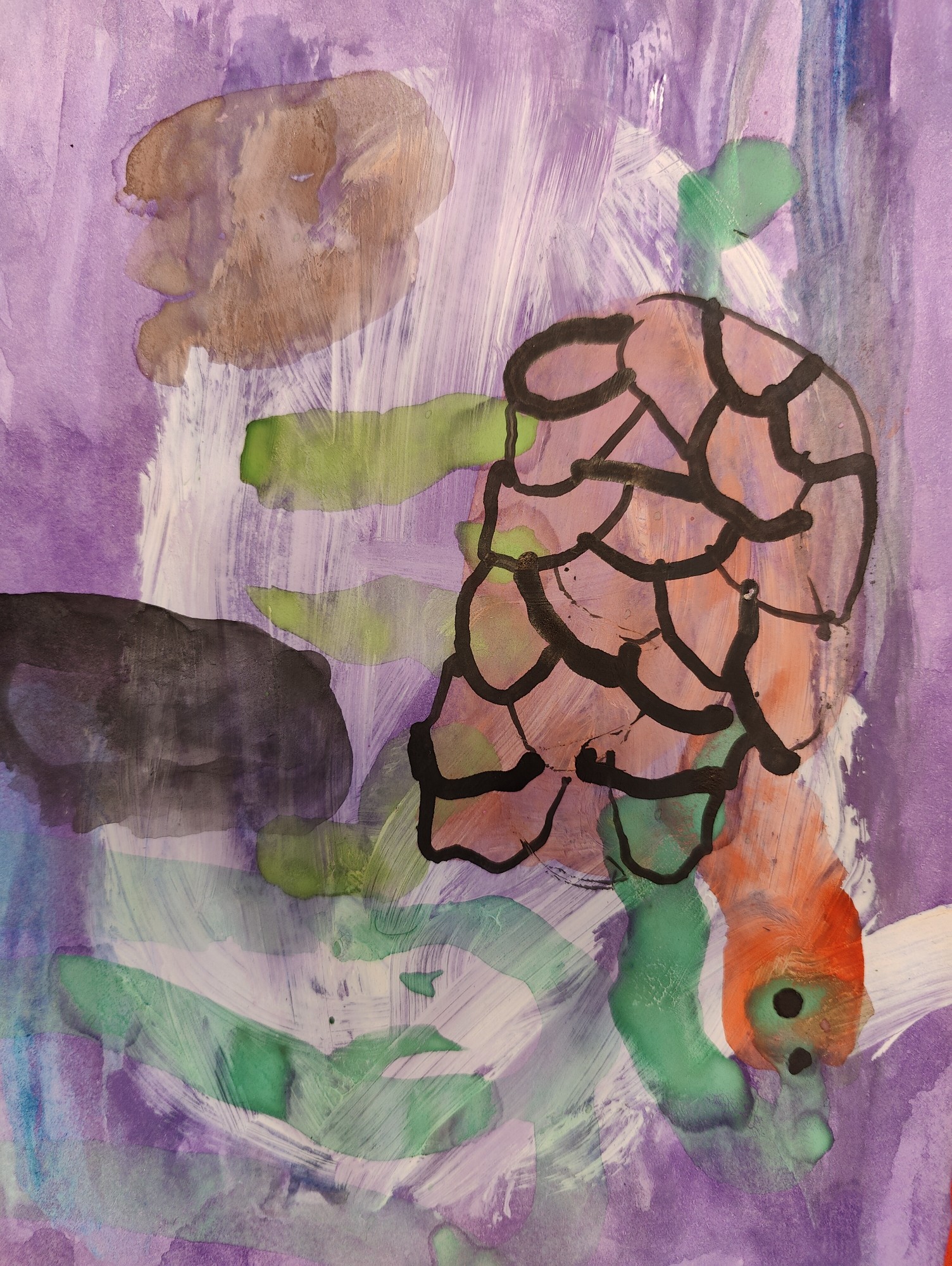 Darbiņš zīmēts izmantojot guašu krāsas un tinti. Laimīgais bruņurupucis skaita akmentiņus,mācās krāsas un izbauda peldi tīrajā okeānā