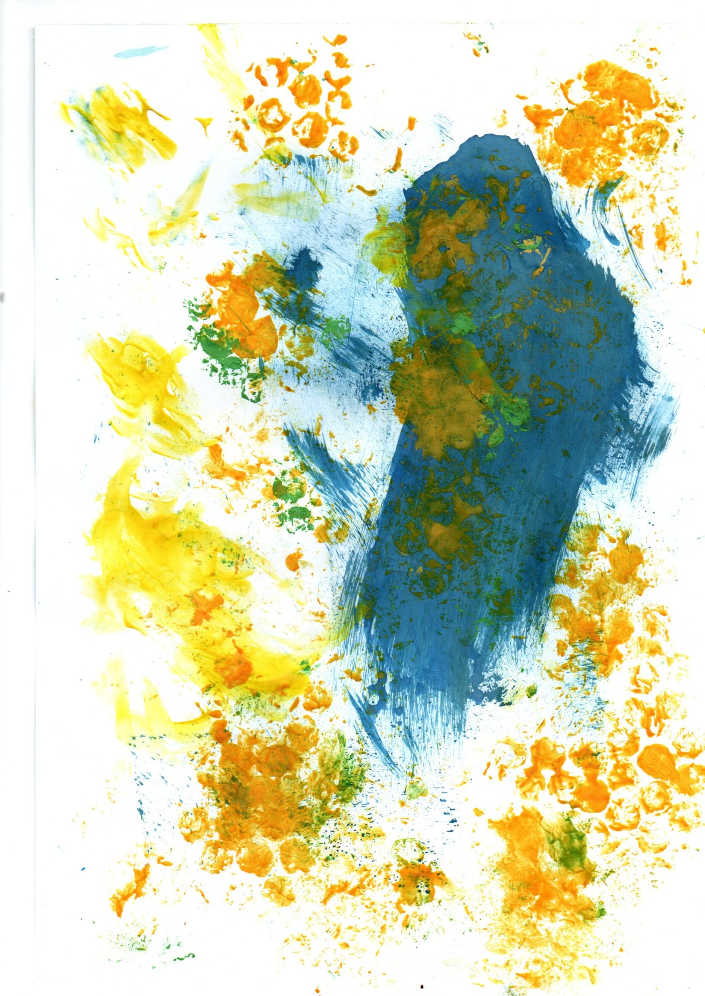 Zilā guaša krāsa uz papīra uzklāta izmantojot švammīti, bet dzeltenā-nokāsojot nelielu burbuļplēves gabaliņu un piespiežot to pie papīra izvēlētajā vietā.
