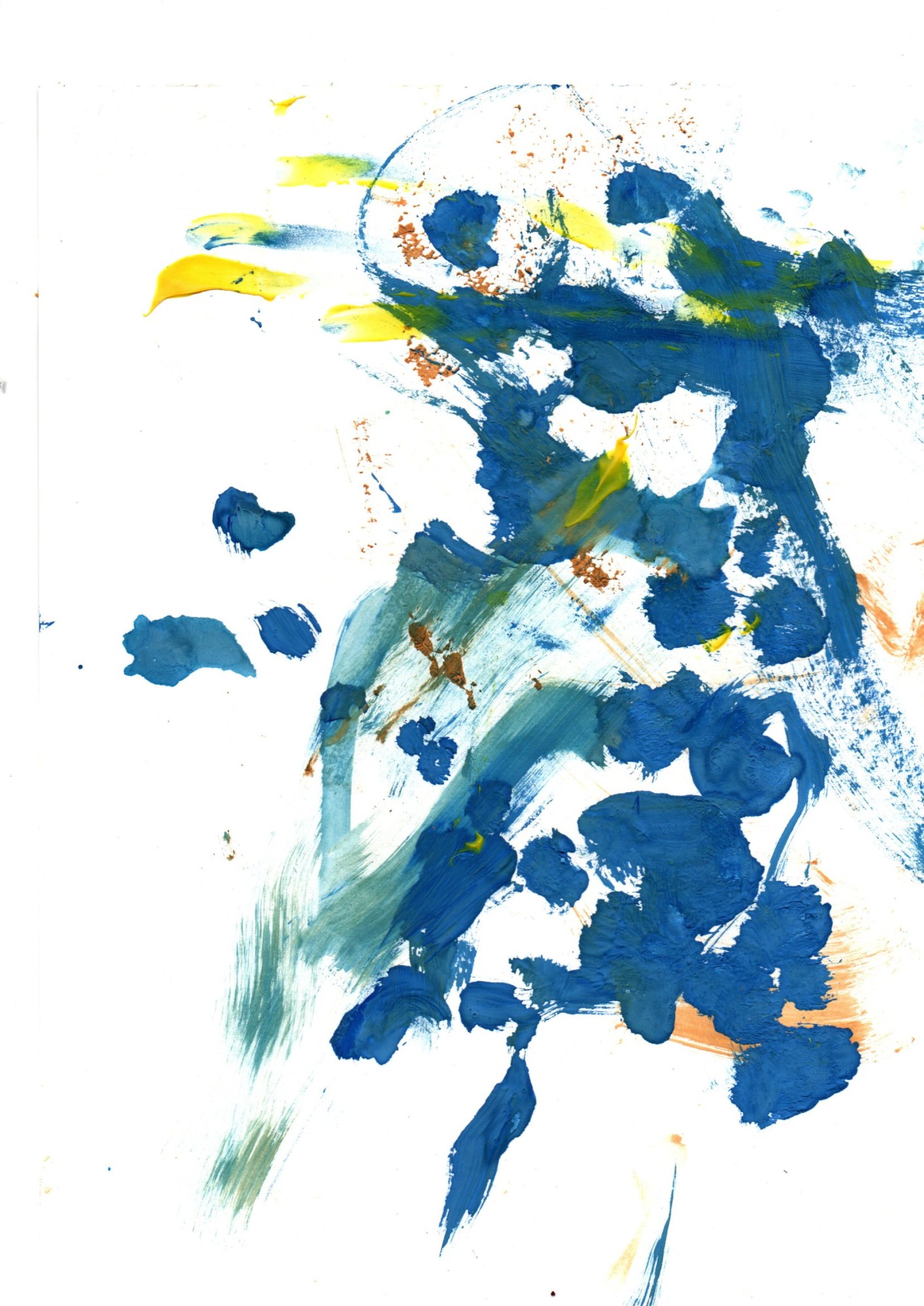Guaša krāsa uz papīra uzklātas ar švammītes un kociņa palīdzību.