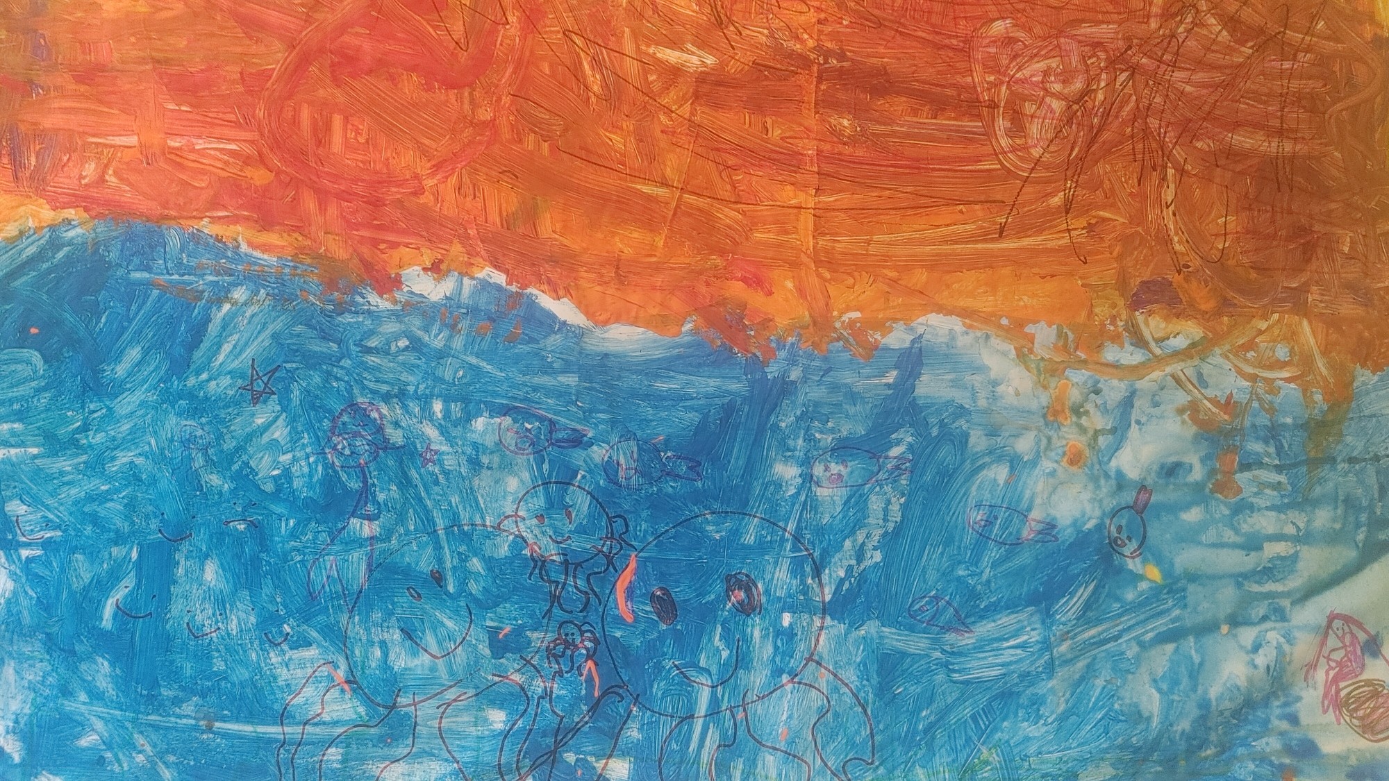 Bērni strādā grupā un darbojas ar guaša krāsām.