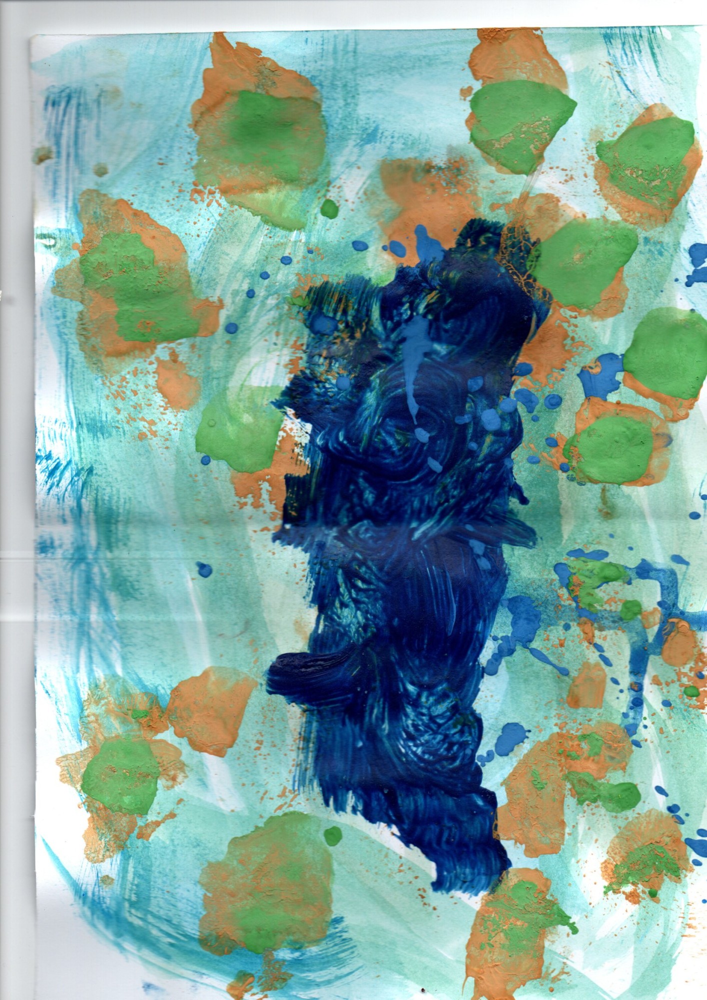 Ar švammītes palīdzību zila guaša krāsa izmantota zīmējot jūru. Tad vienā lapas pusē ar platu otu uzklāti saules atspulgi ūdenī- dzeltenā un zaļā krāsā, lapu pārlokot uz pusēm un saspiežot "atspulgi" veidojas arī otrā zīmējuma lapas daļā. Kuģis zīmēts aršvammītes palīdzību, izmantojot tumši zilu guaša krāsu.