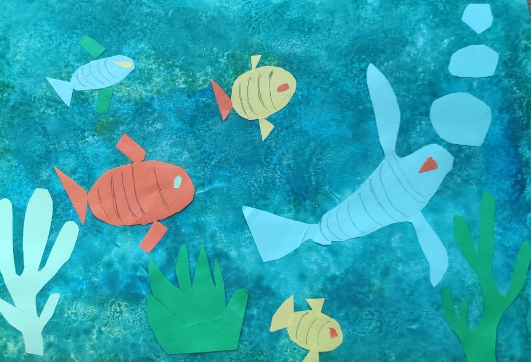 Zilā ir lielākā zivs - skolotāja. Pārējie ir skolēni, viņi dodas ekskursijā izpētīt okeāna dzelmi.