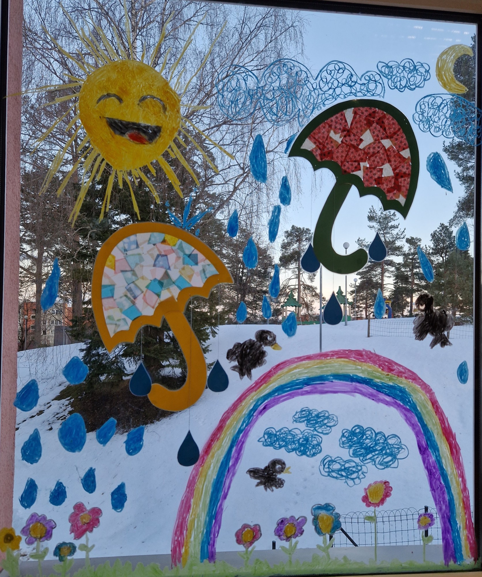 Kad saulīte izkausē sniegu, tas pārvēršas par ūdeni. Ūdens pilītes iztvaiko un dzīvo mākonīšos. Tās kļūst par sniegpārsliņām vai lietutiņu un atkal krīt lejā uz zemes. Mēs ļoti gaidām vasaru, kad saule ar lietiņu izveido varavīksni. Mēs uzzīmējām savējo, lai visiem prieks!
