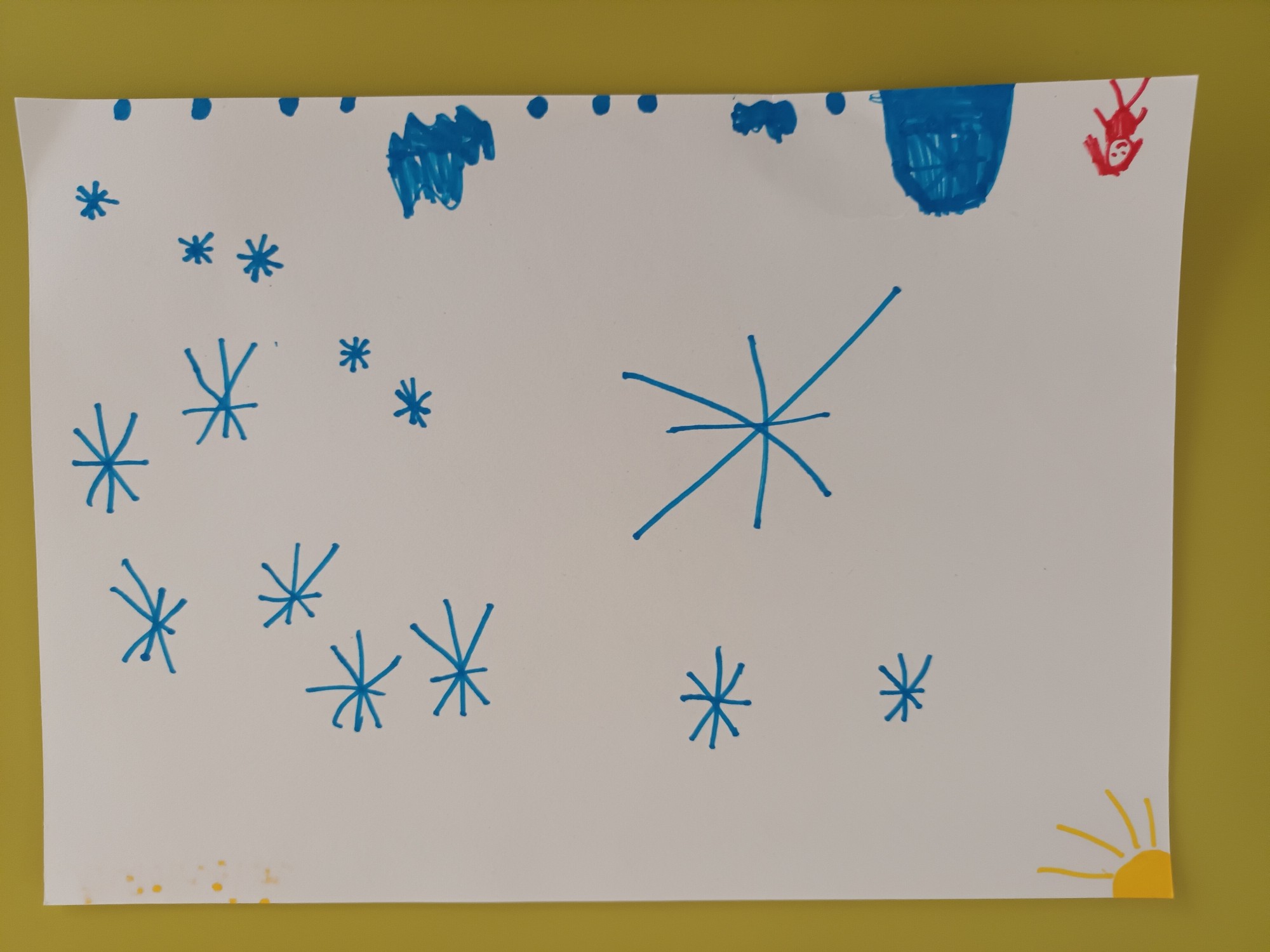 Liels sniega kalns. Ūdens veidojas no sniega,peļķe. Sniegpārslas krīt. Cilvēks iet uz sniega kalnu priecāties. Mazais sniegs.