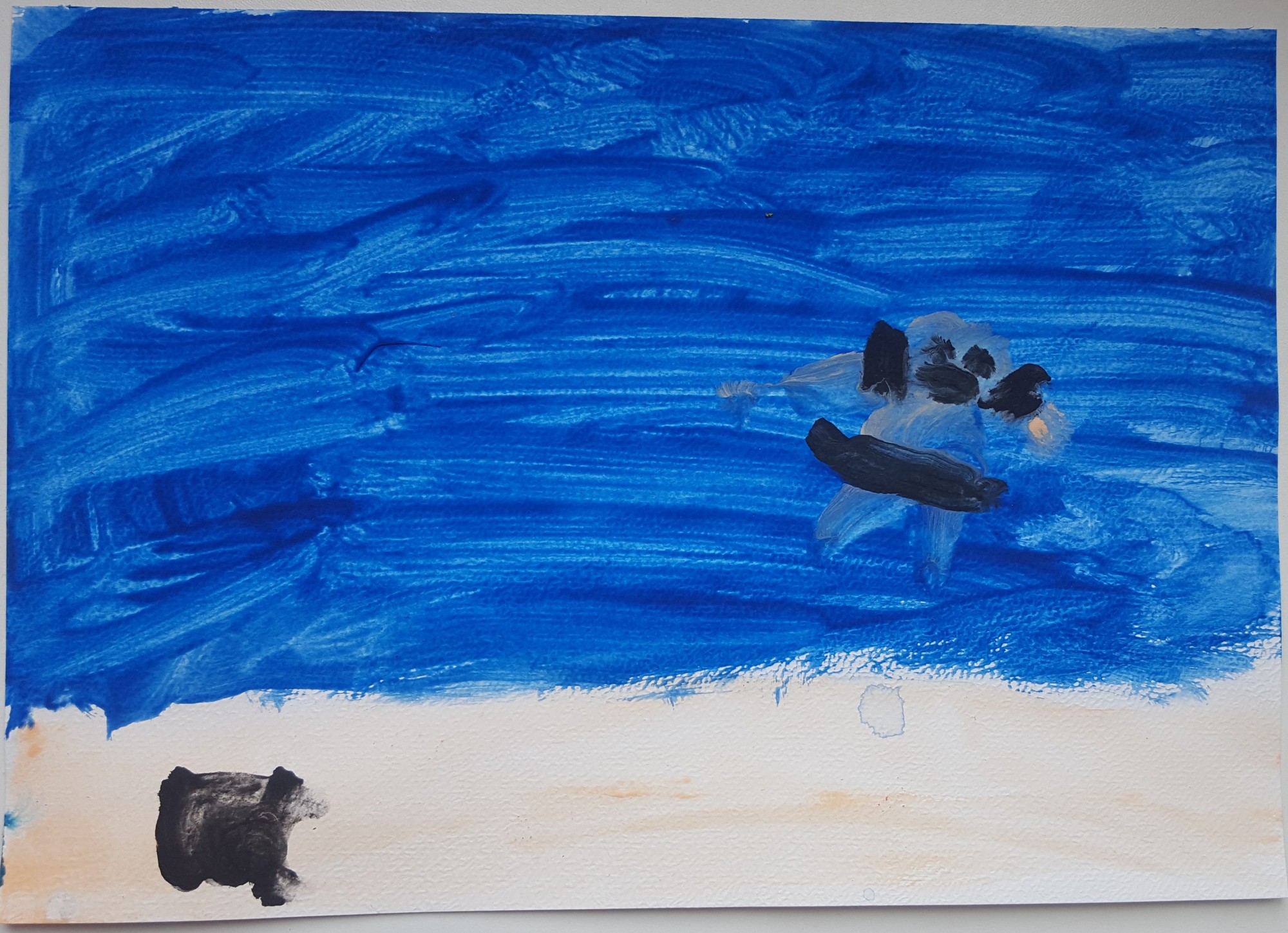 Zīmējumā attēlota jūra un tajā peldas cilvēks.
