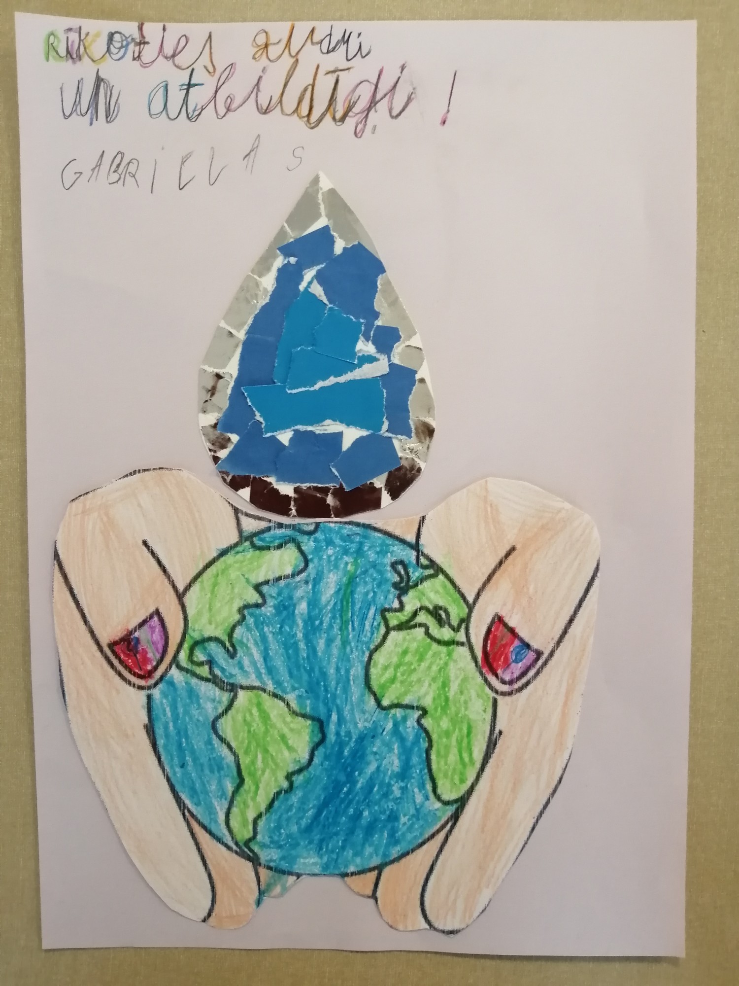 Ūdens mūsu pasaulē. Krāsu zīmuļi, aplikāciju papīrs.
