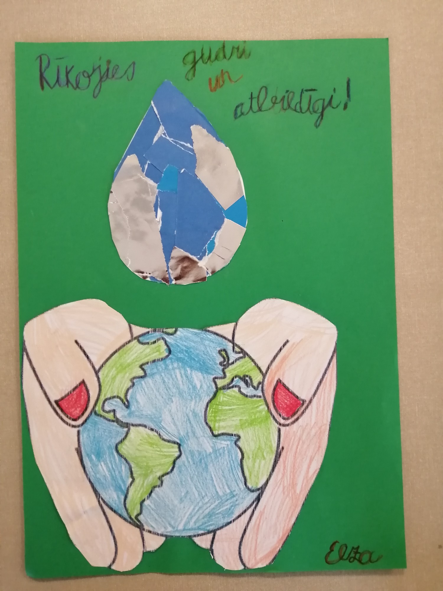 Ūdens mūsu pasaulē. Krāsu zīmuļi, aplikāciju papīrs.