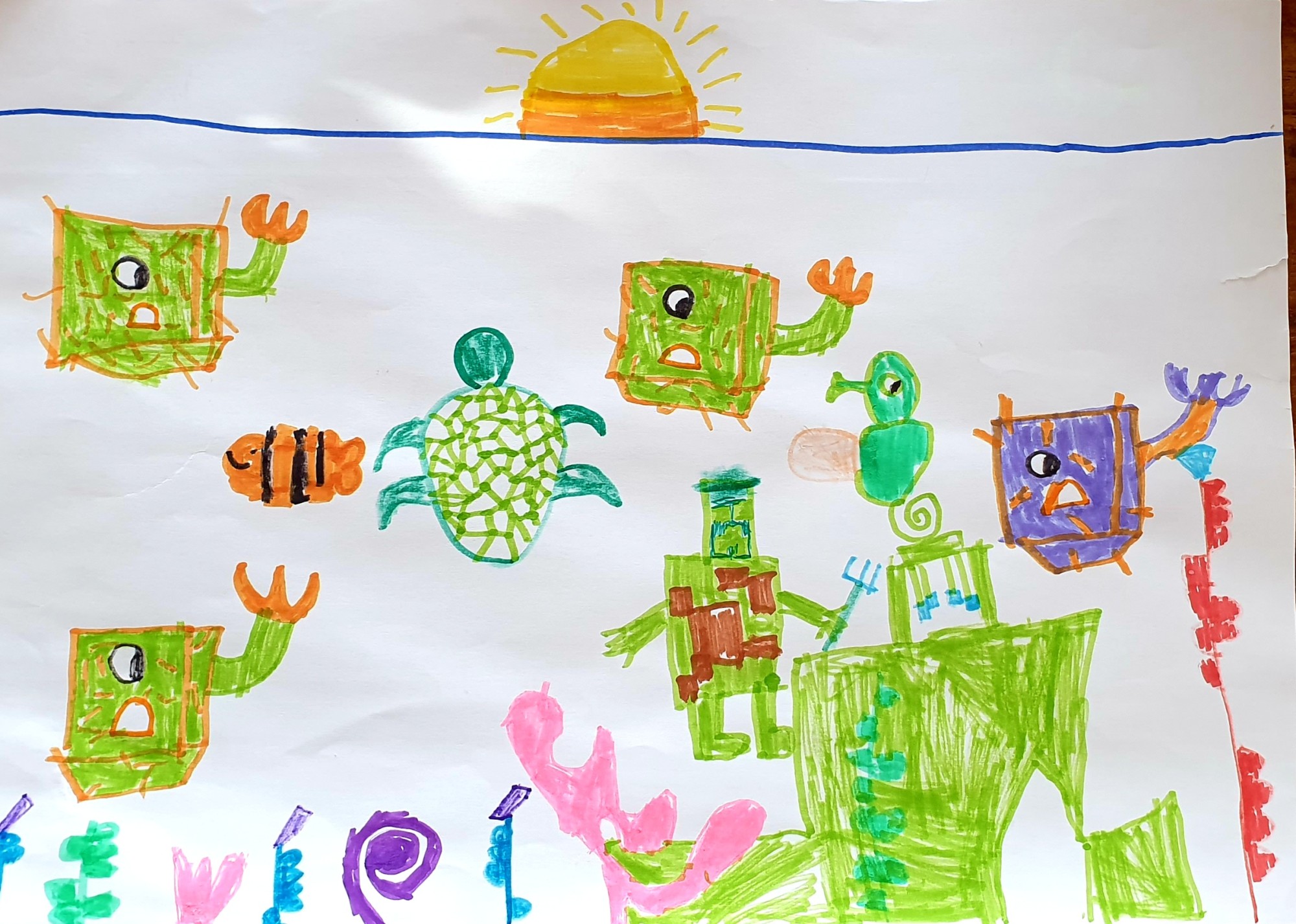 Zemūdens valstībā jūraszirdziņš gaida mazuli, to sargā zemūdens pasaules valdnieks. Ūdens ir balts, jo ir ĻOOOTI tīrs. Jūras zālēm galos aug maģiski kristāli, kas attīra ūdeni. Kantainie radījumi ir sargi zemūdens pasaules valdniekam.