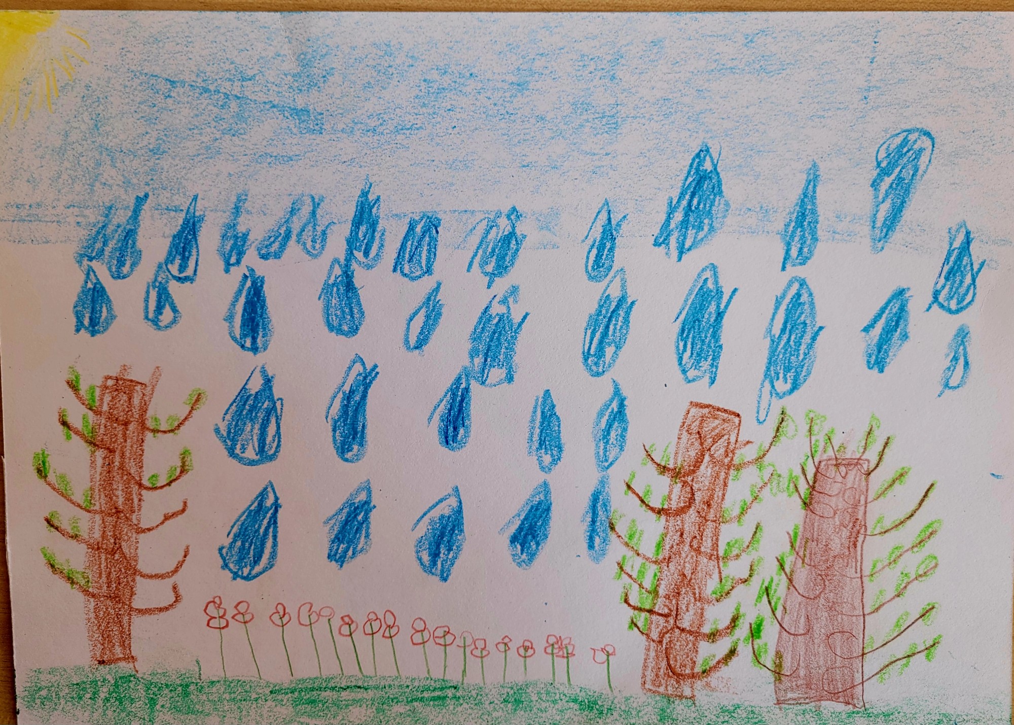 Koki, puķes un zāle aug no ūdens lāsēm.