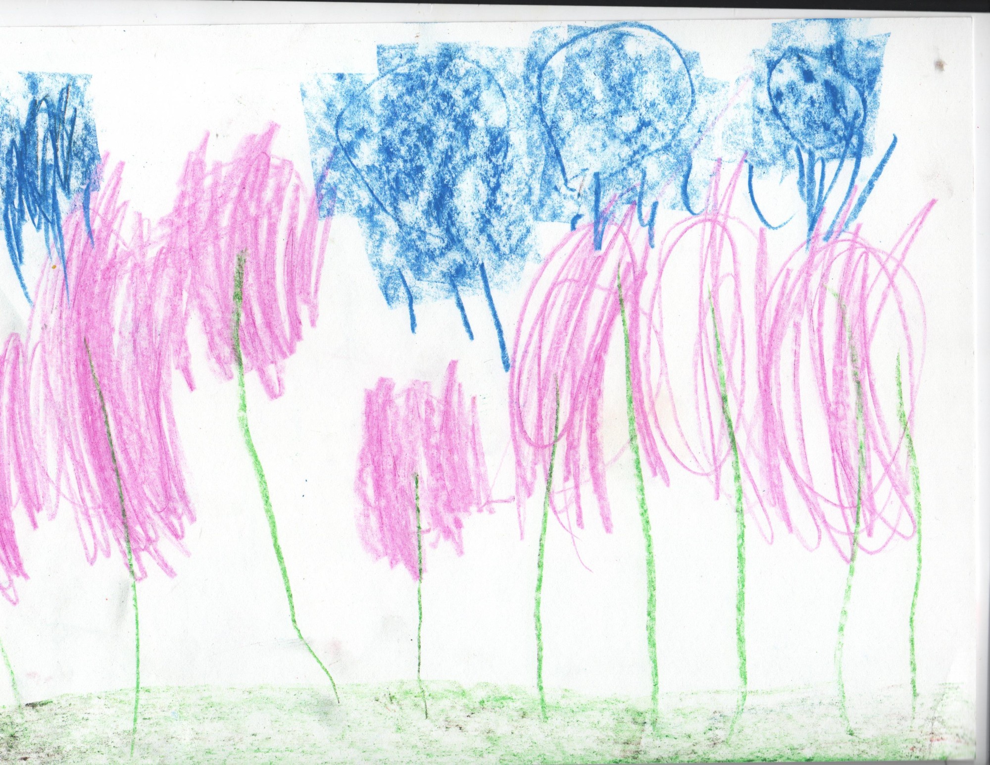 Zīmējumā ir attēloti mākoņi, līst lietus un aug skaistas puķes.